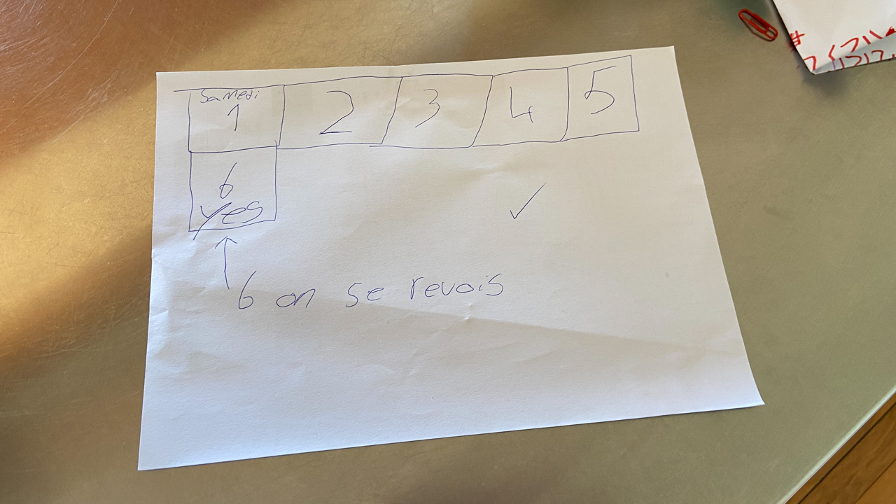 Quand je partais en randonnee seul, et que je laissais Adan et Petit Papa a la maison, je faisais un petit calendrier pour aider Adan a visualiser les jours avant les retrouvailles. A l'approche de la rando Harman Pass que je vais faire avec Adan, c'est ce dernier qui a fait un calendrier pour son frere!