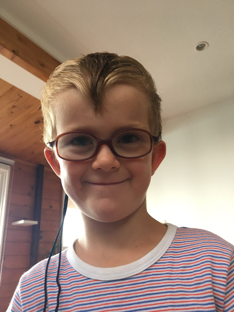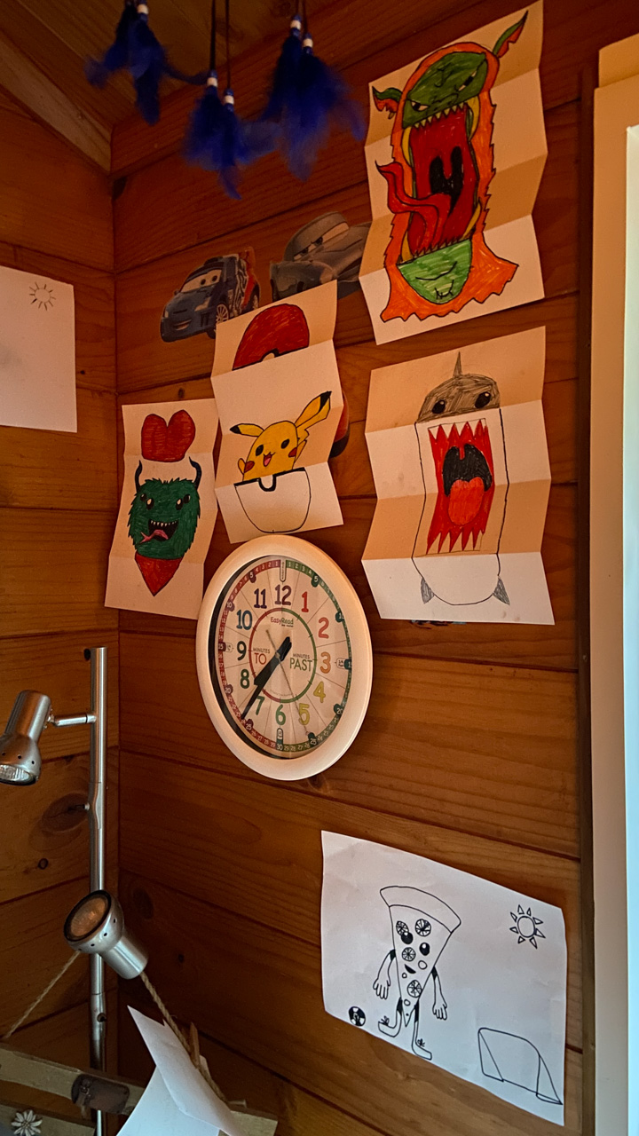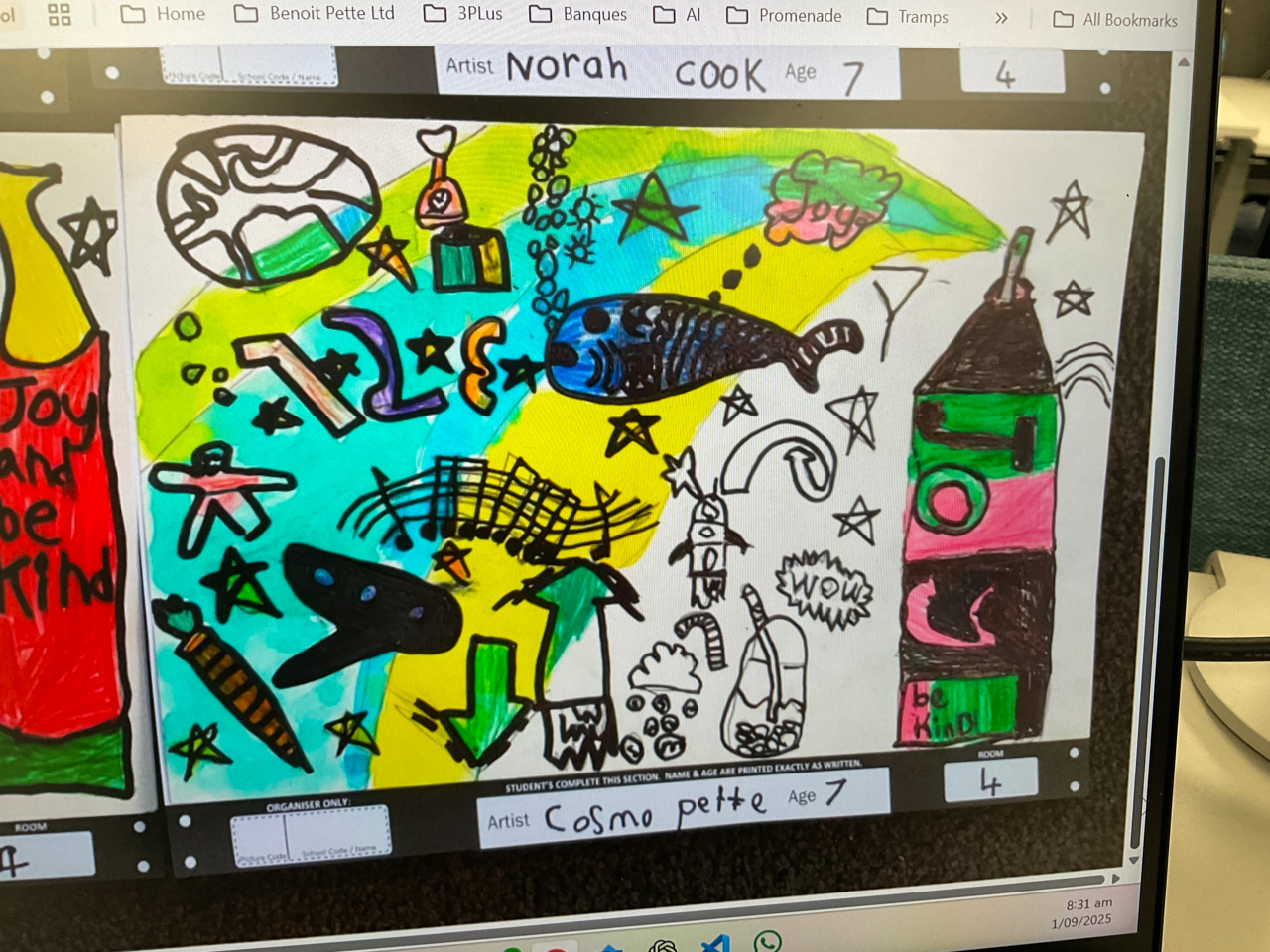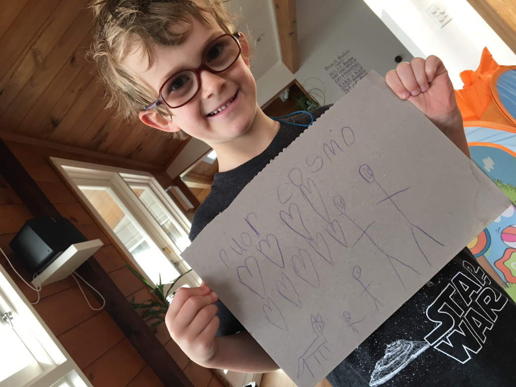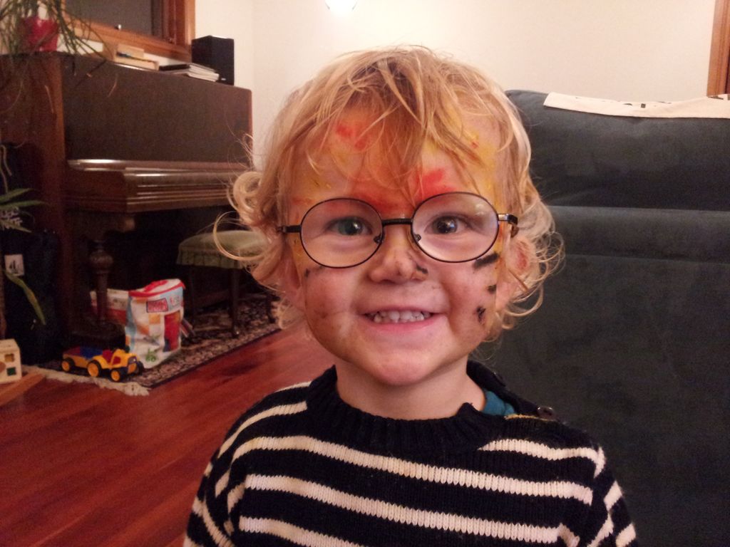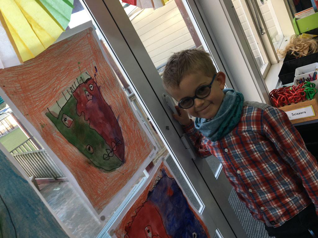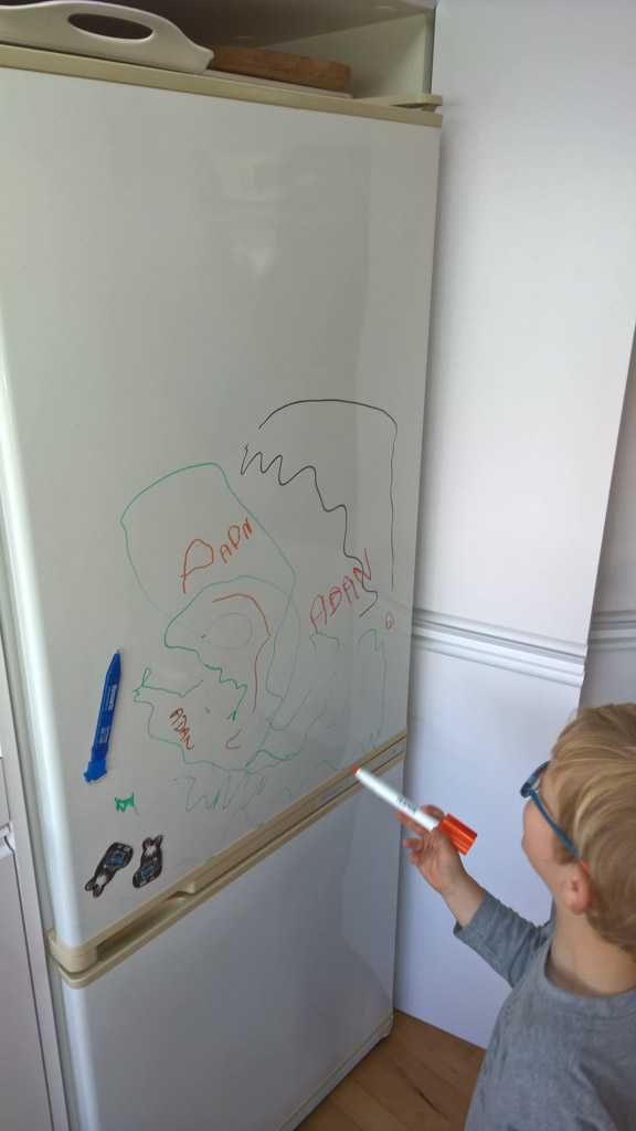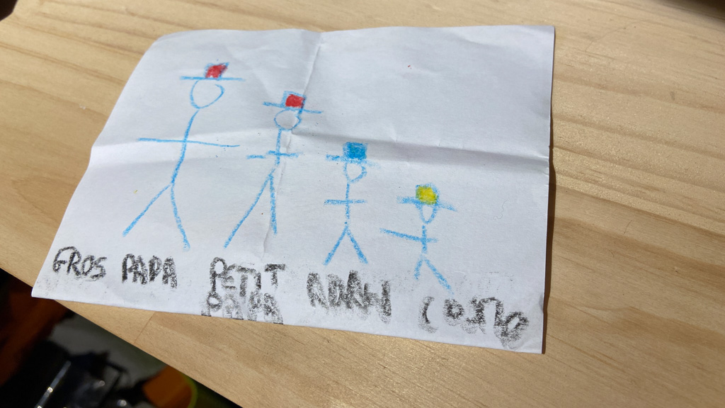 Cosmo est revenu de l'ecole avec quelques artworks ... dont un autoportrait qu'il a accroche sur ma fenetre de bureau!