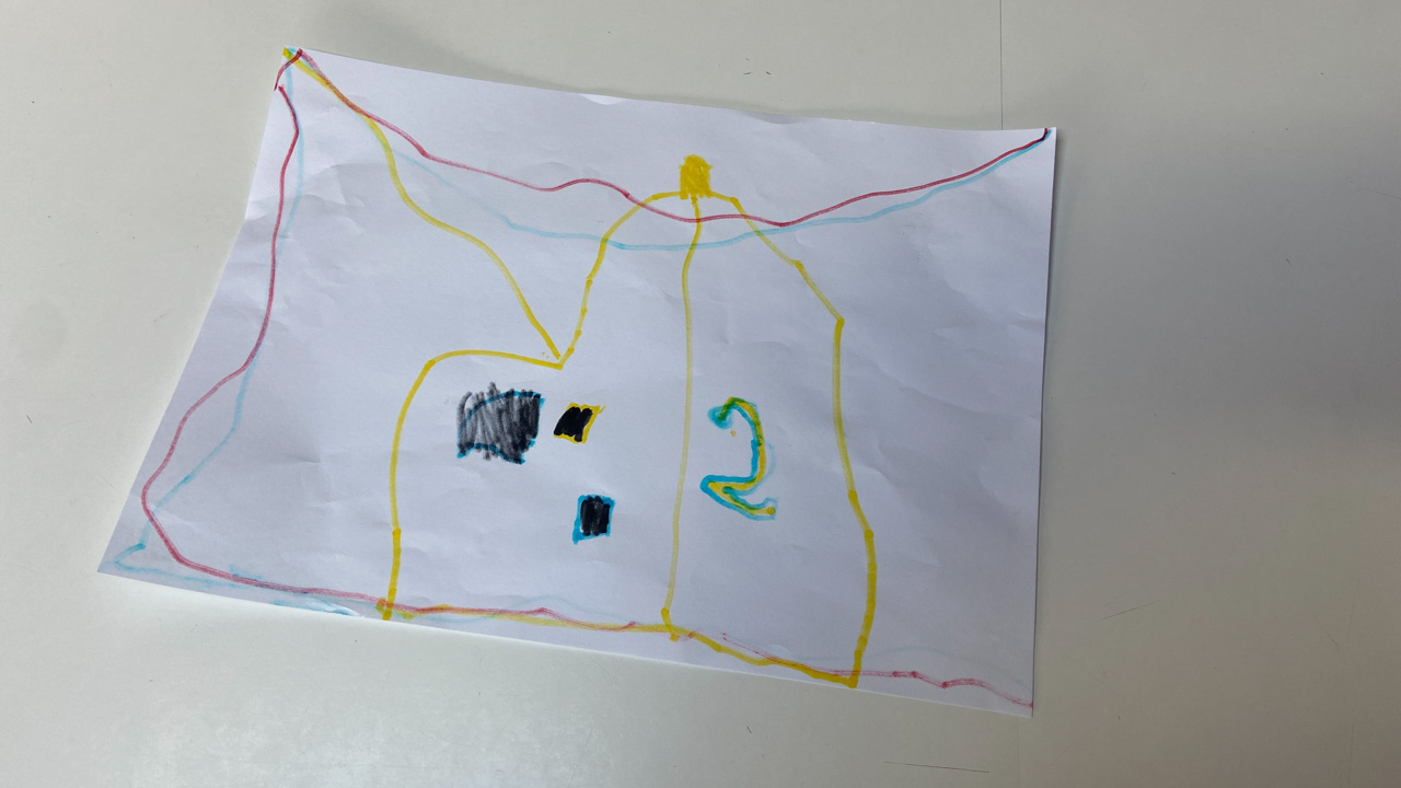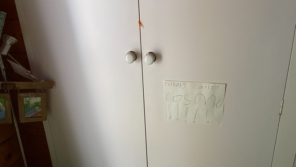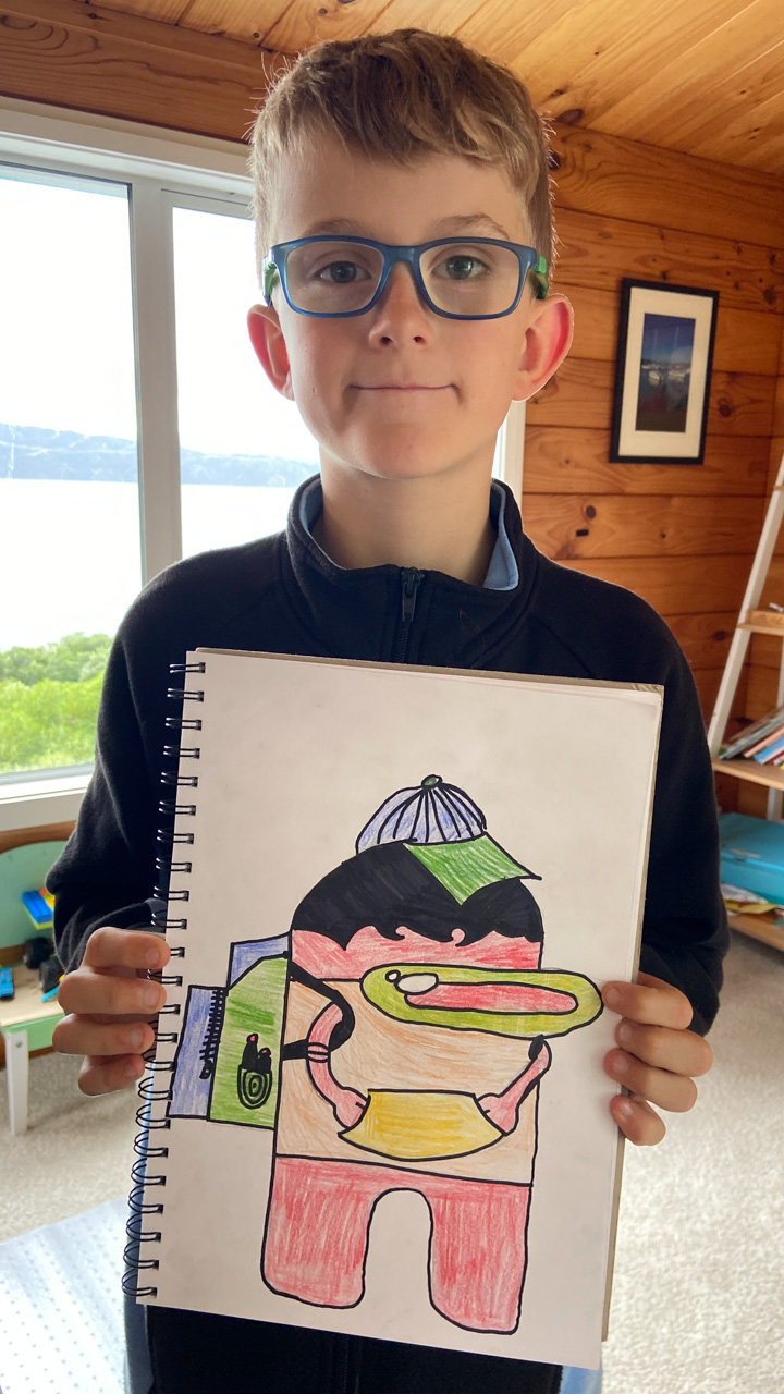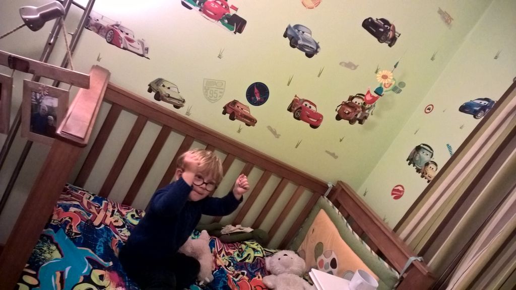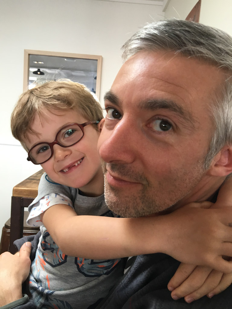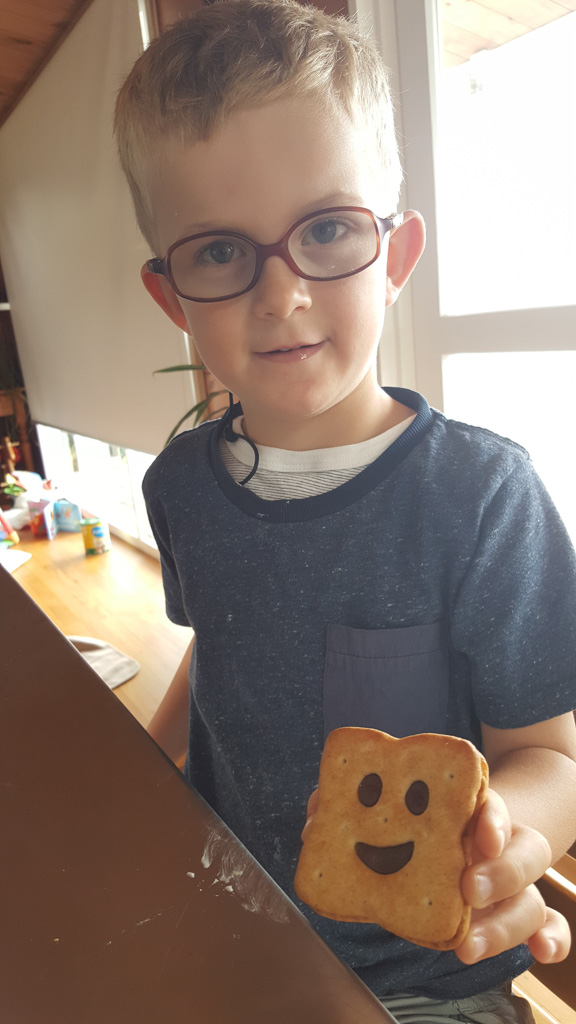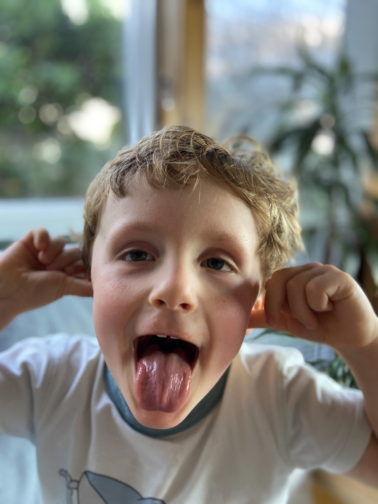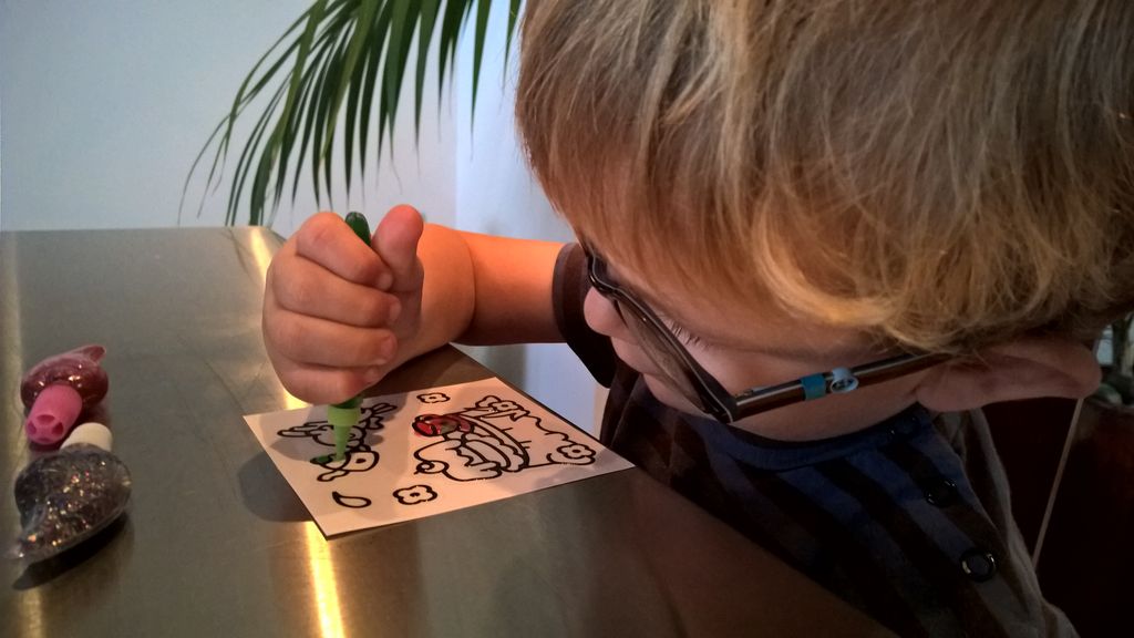Cosmo est revenu de l'ecole avec quelques artworks ... dont un autoportrait qu'il a accroche sur ma fenetre de bureau!