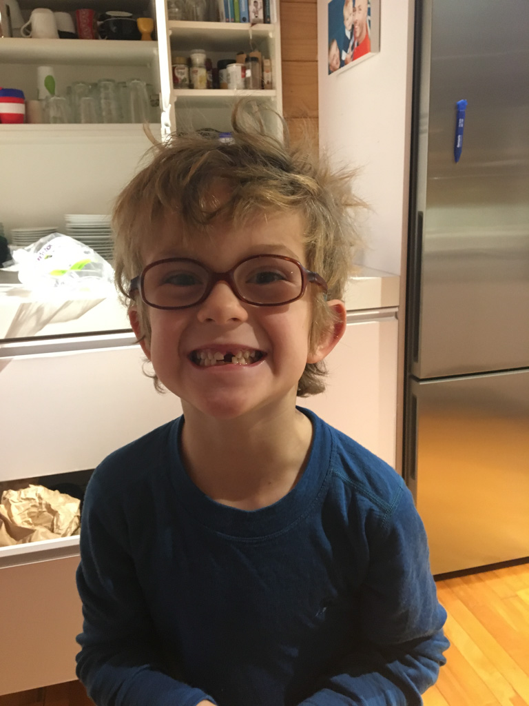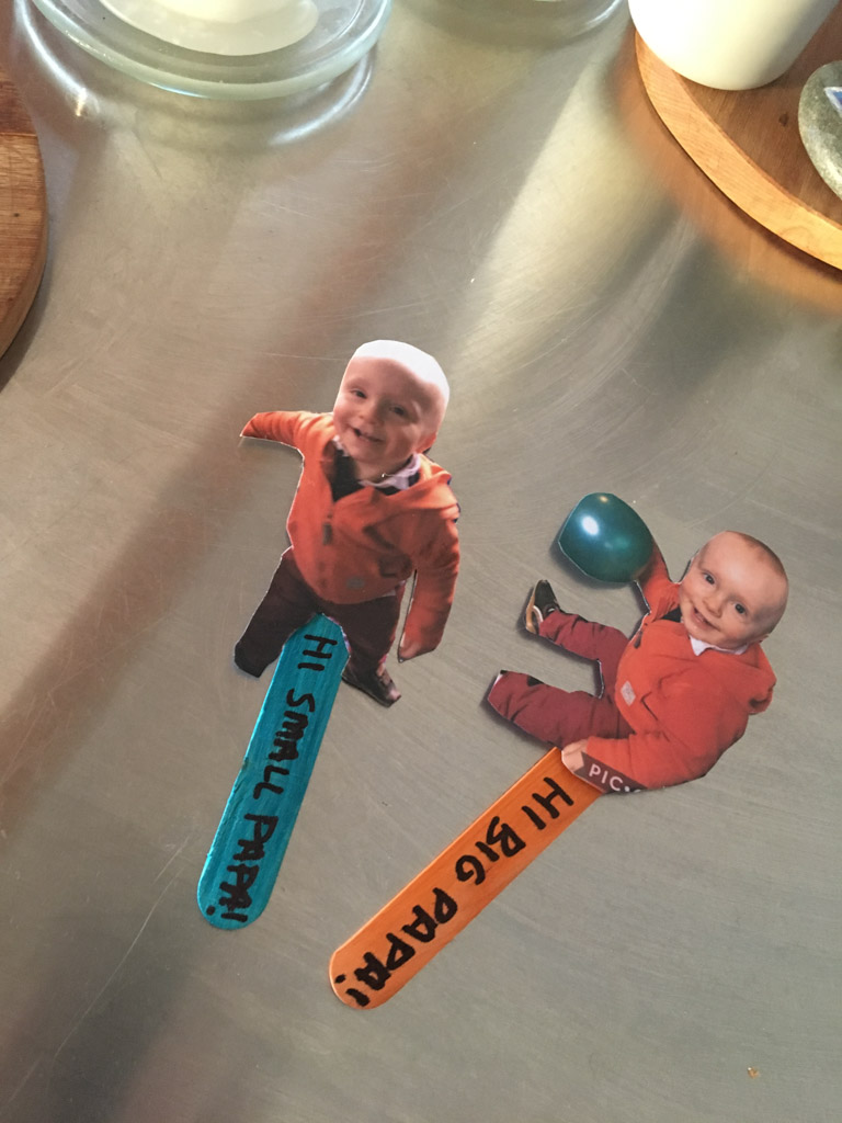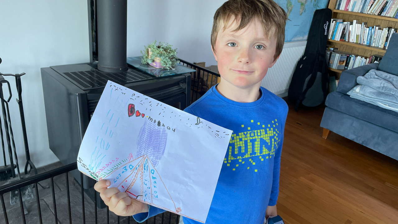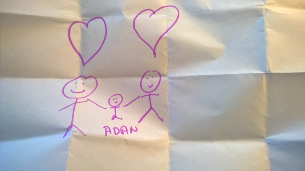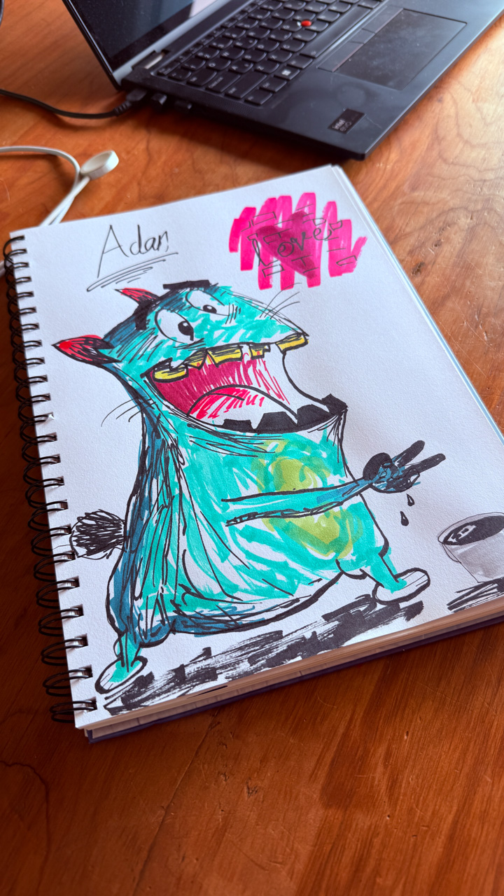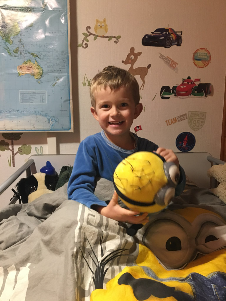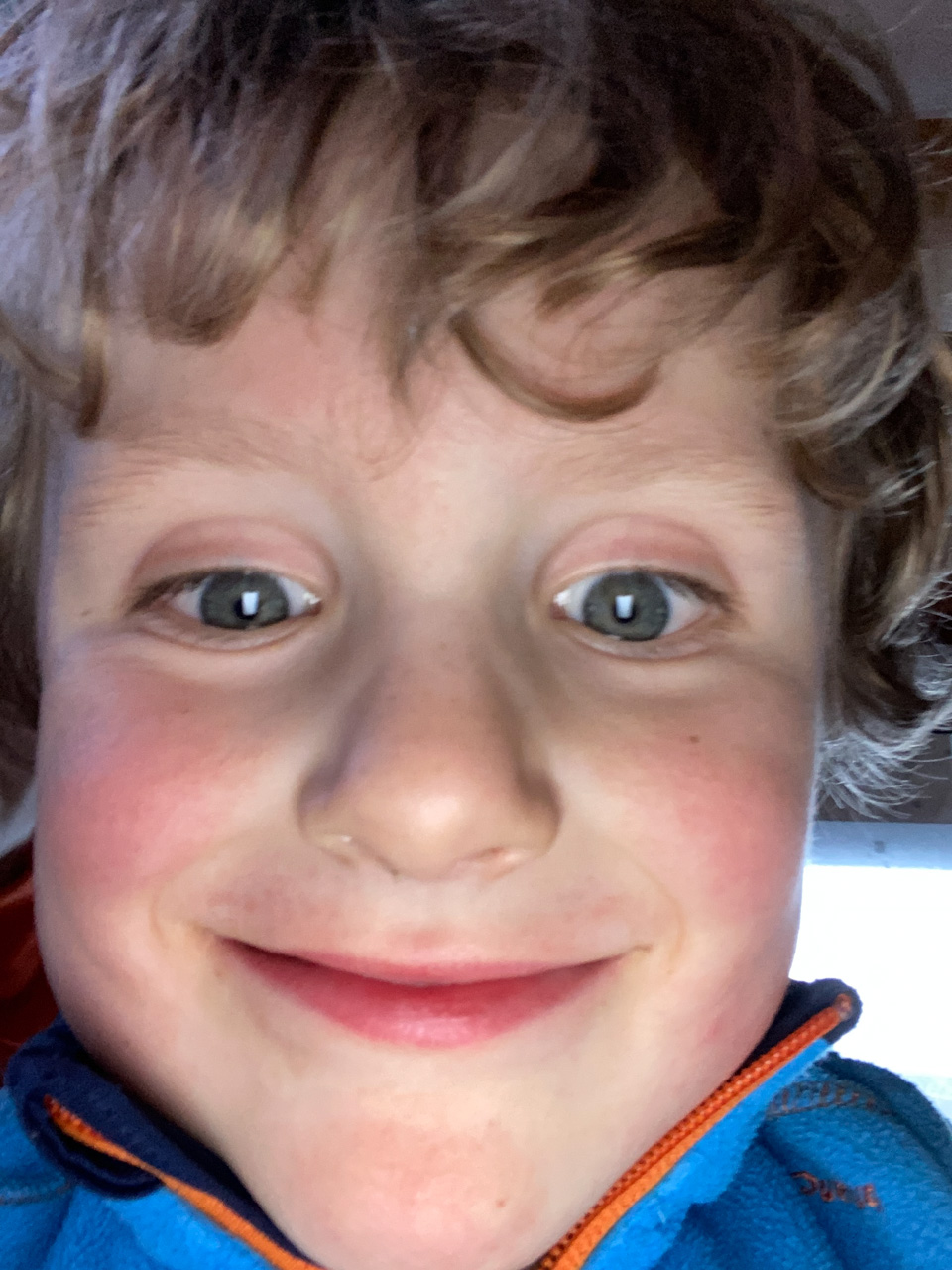 Cosmo est revenu de l'ecole avec quelques artworks ... dont un autoportrait qu'il a accroche sur ma fenetre de bureau!