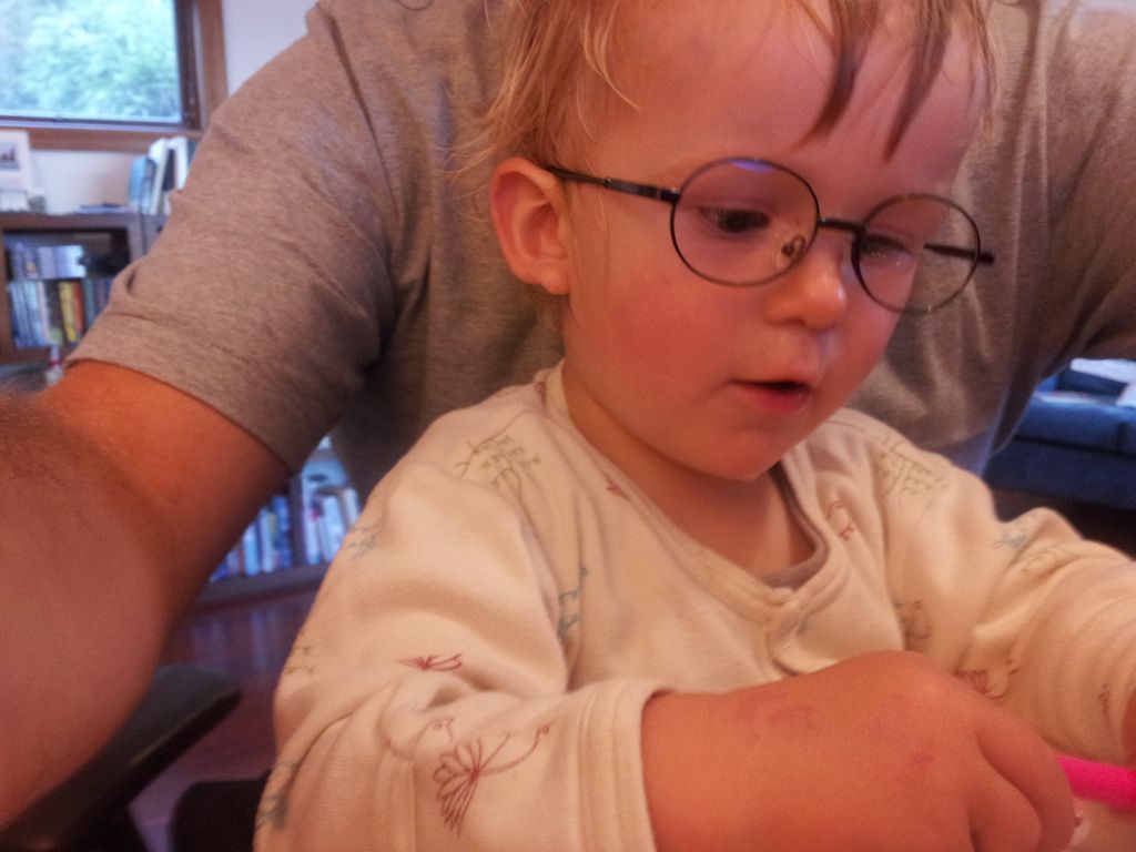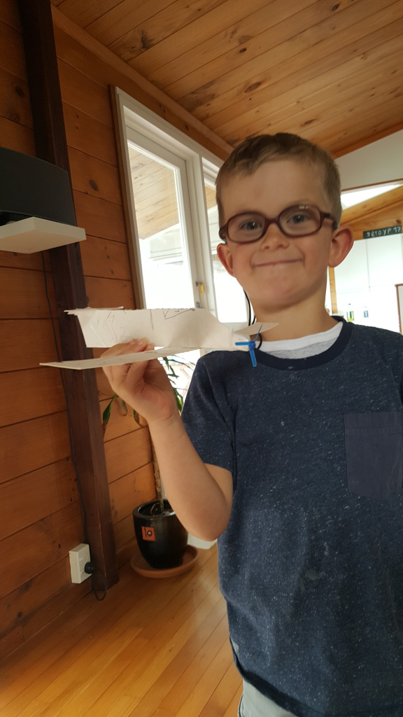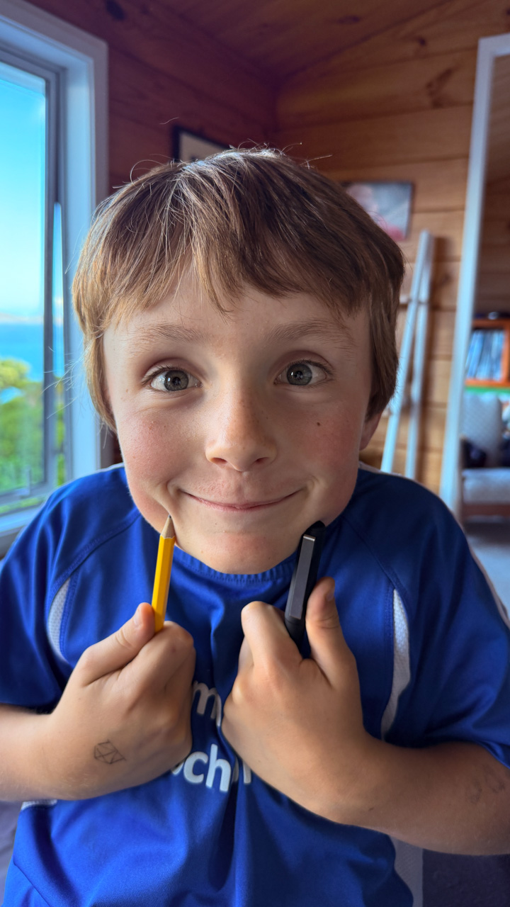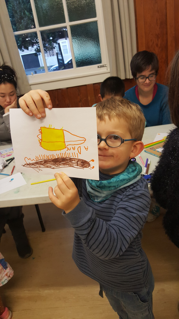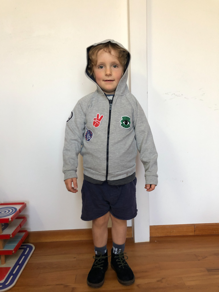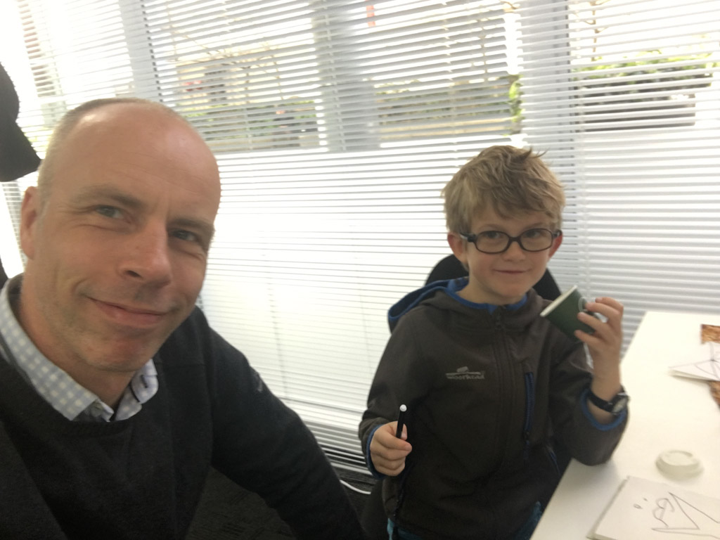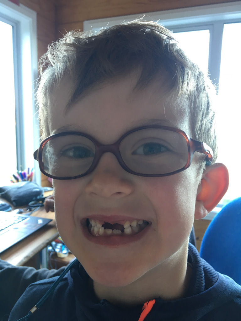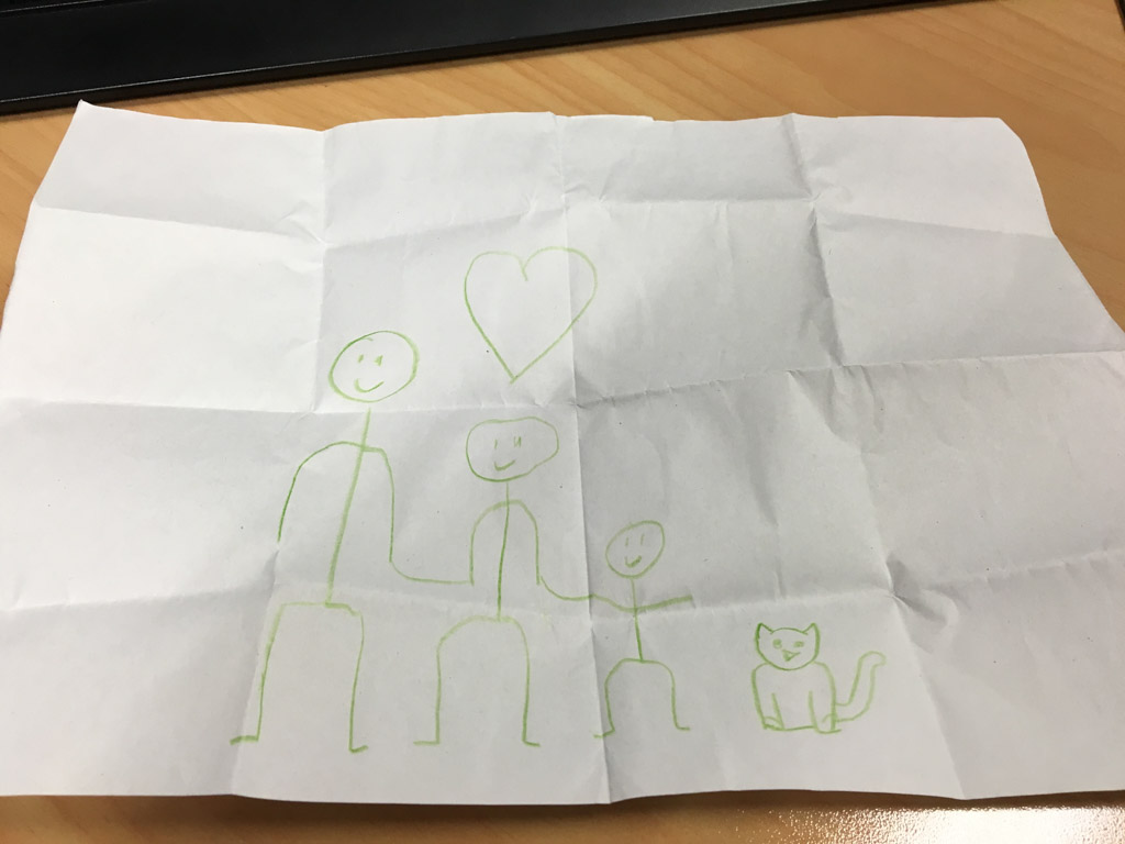 Cosmo est revenu de l'ecole avec quelques artworks ... dont un autoportrait qu'il a accroche sur ma fenetre de bureau!