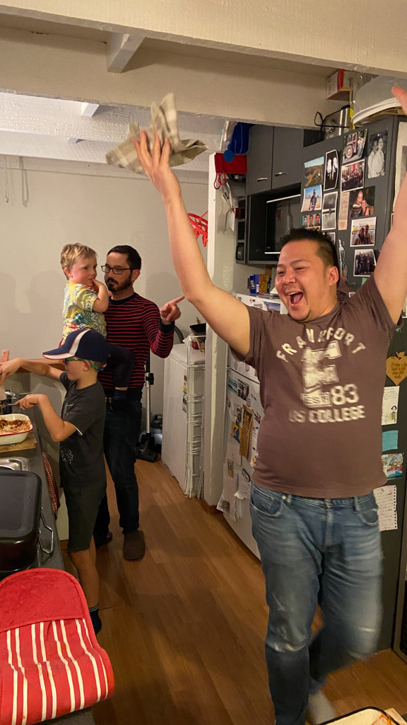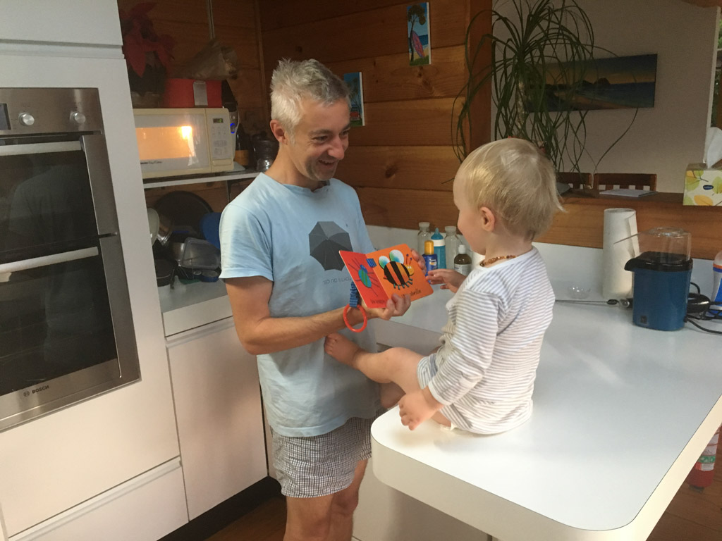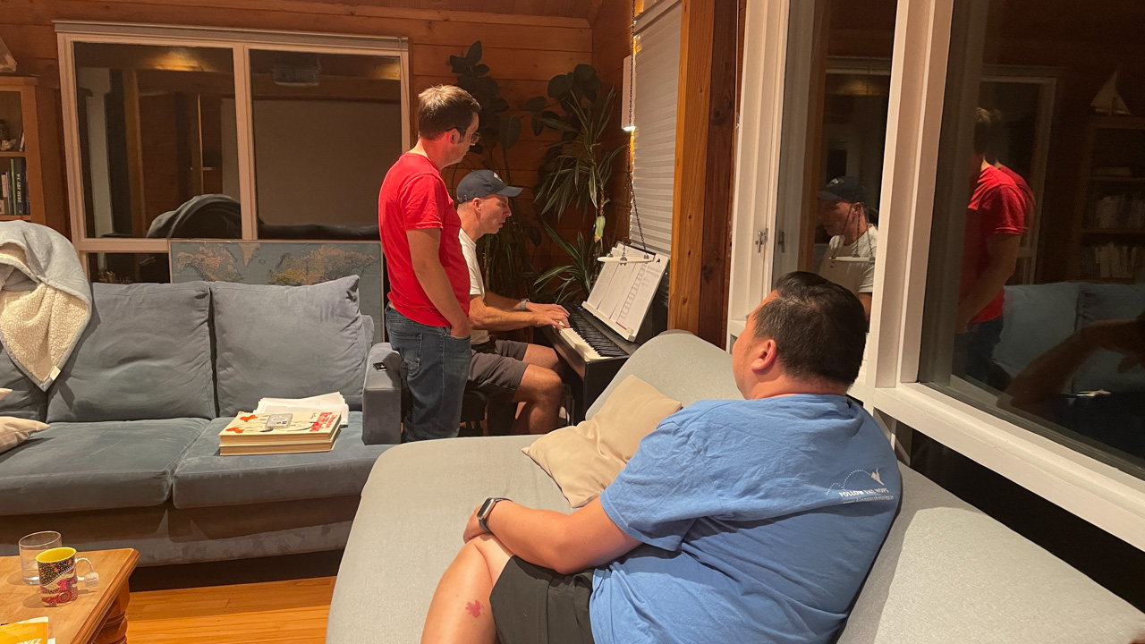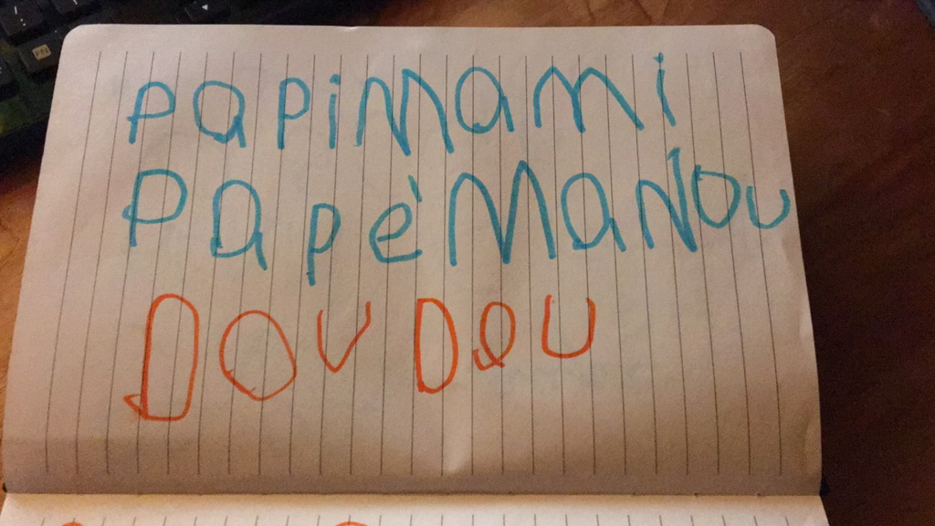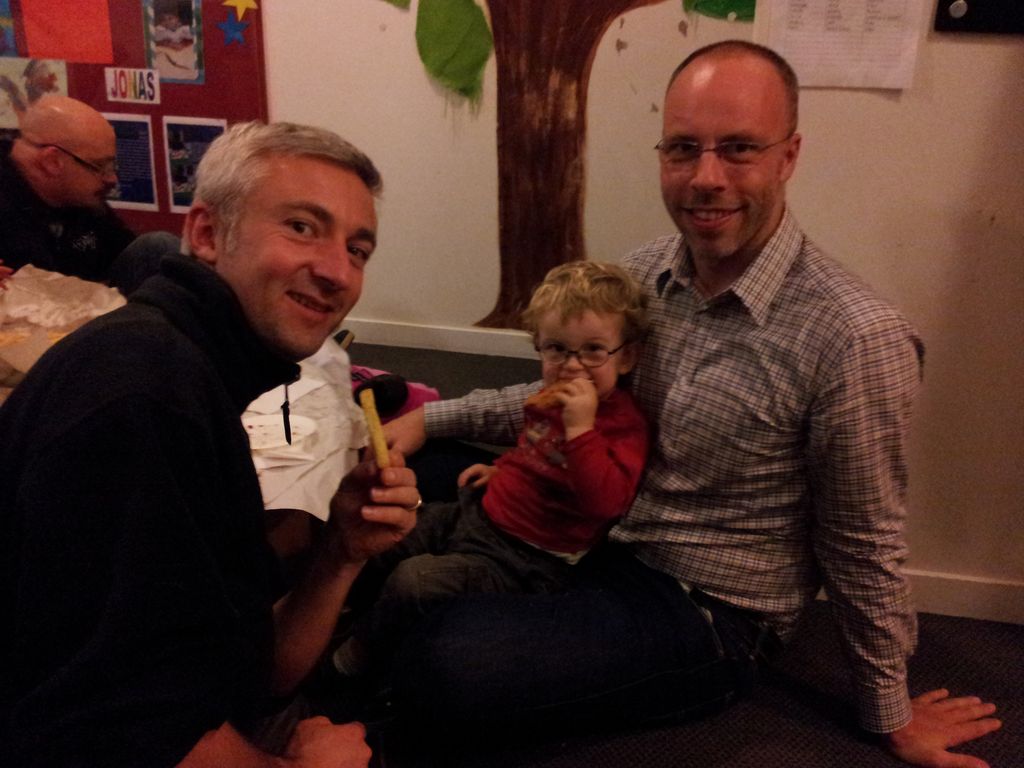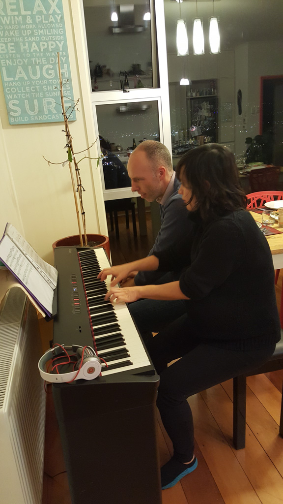 Cosmo a lance cette proposition: on joue Hallelujah, avec lui au piano, Petit Papa a la guitare, et Gros Papa au chant. Et ca a bien marche!!