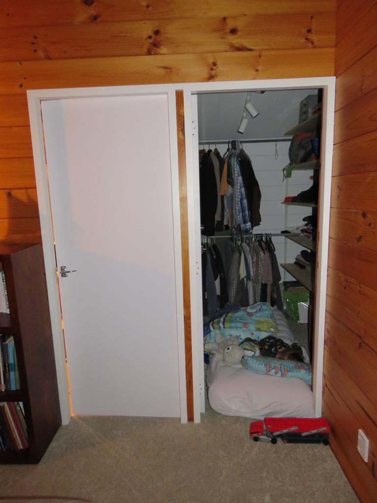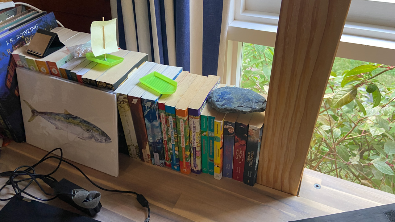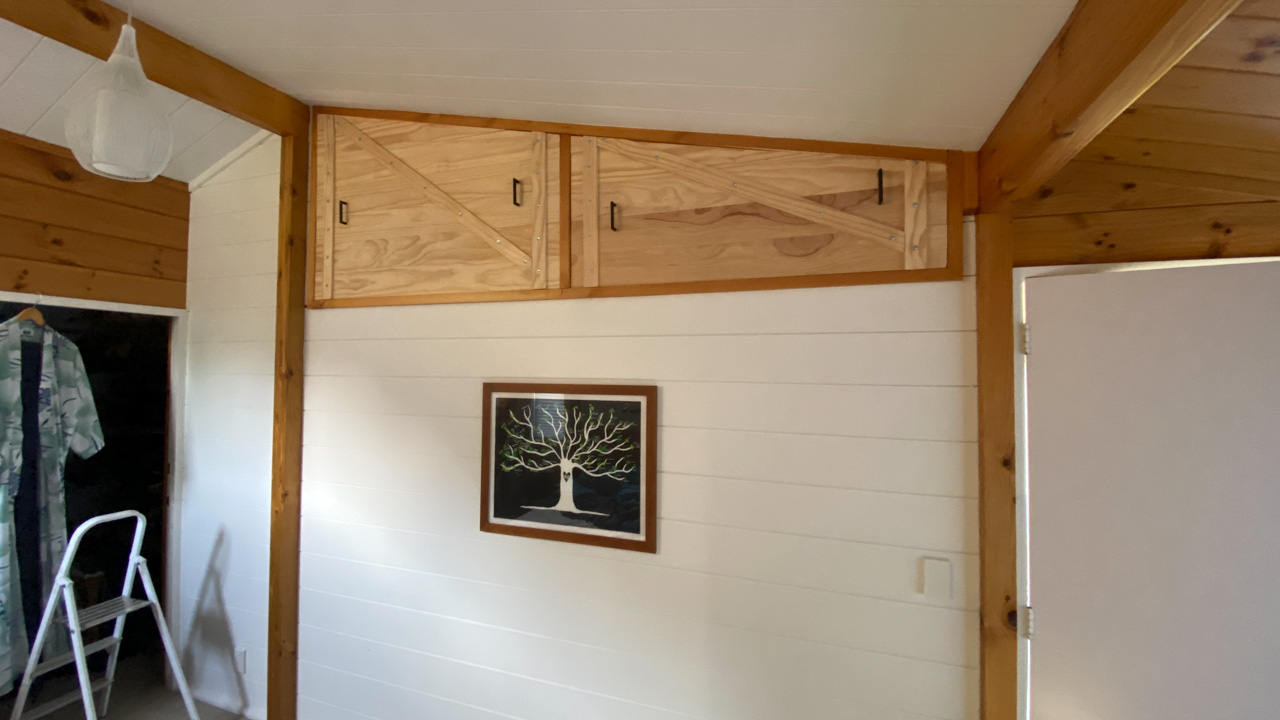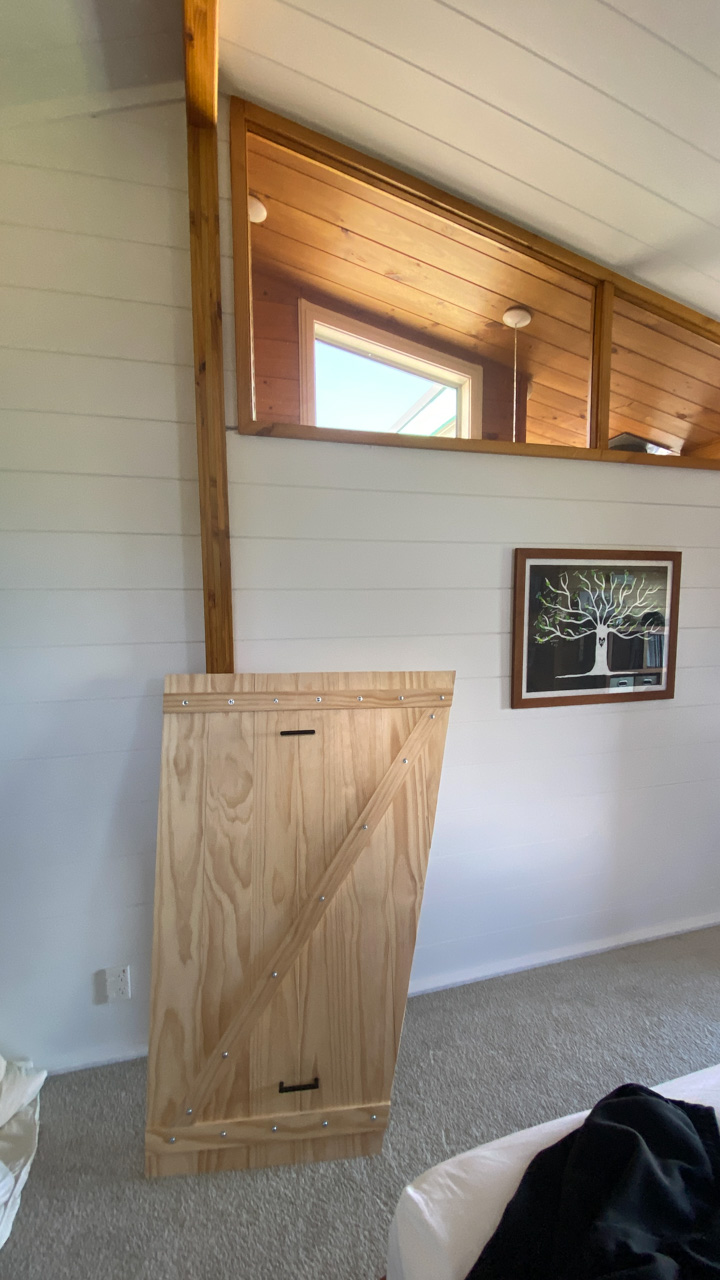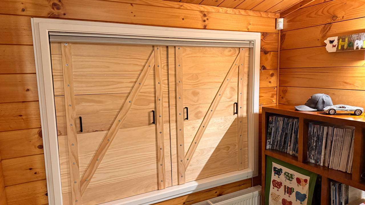 Ce sont les derniers volets que j'ai fabrique pour la chambre. Il y a bien un store sur cette fenetre orientee plein Est, mais sa capacite a retenir les rayons de l'aube est proche de zero! Du coup, j'ai rajoute 2 volets aux 4 deja fabriques plus tot dans l'annee. Apres pres de 10 ans a Fortification road, nous avons enfin de la vrai penombre dans notre chambre!