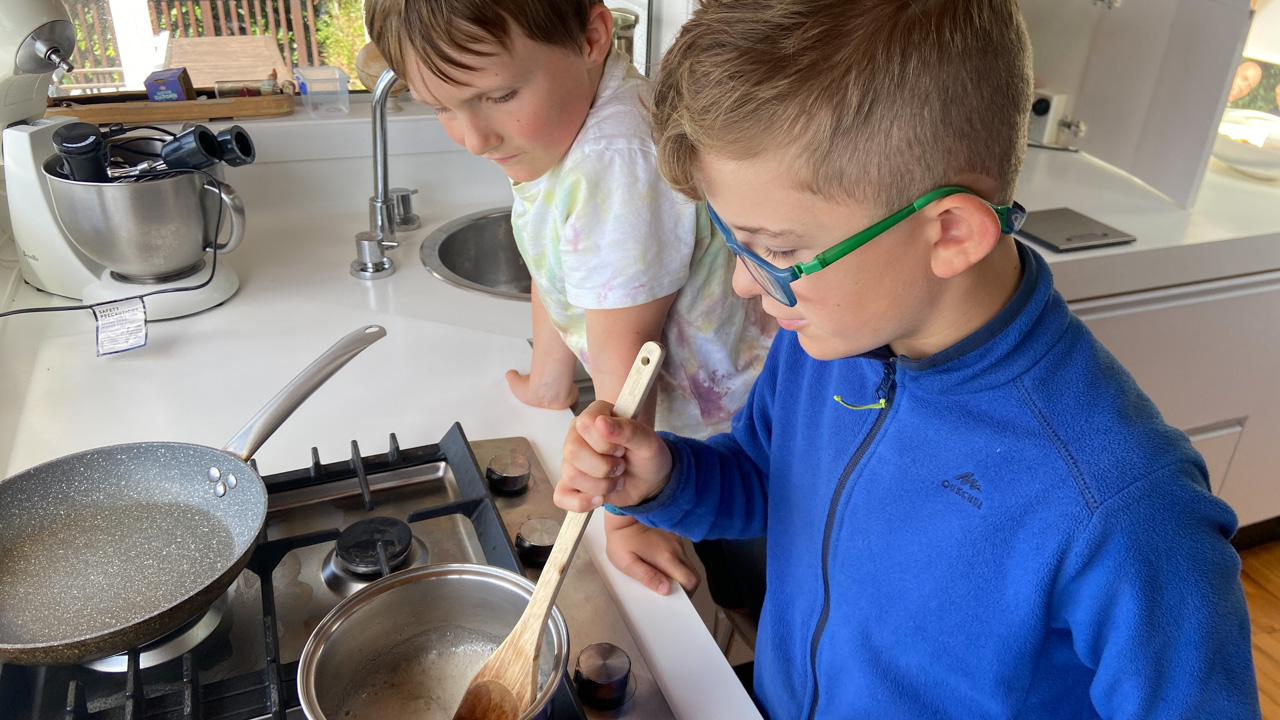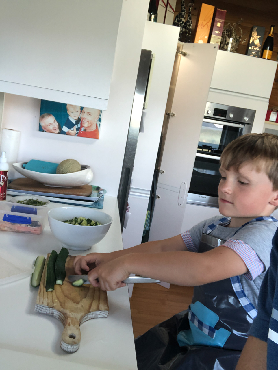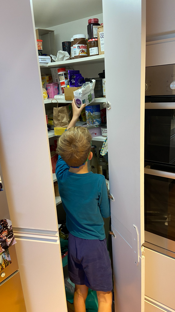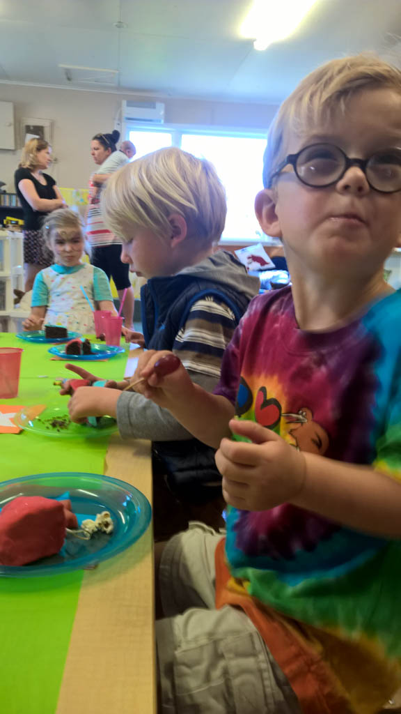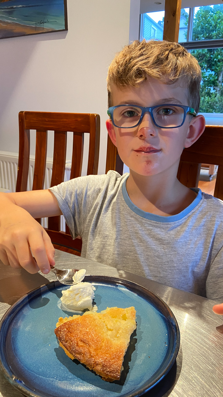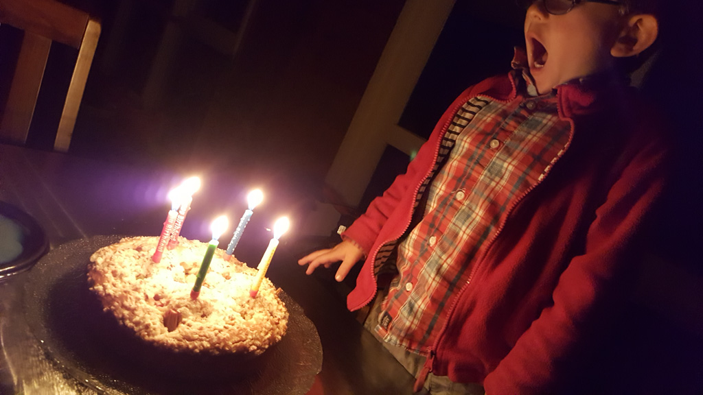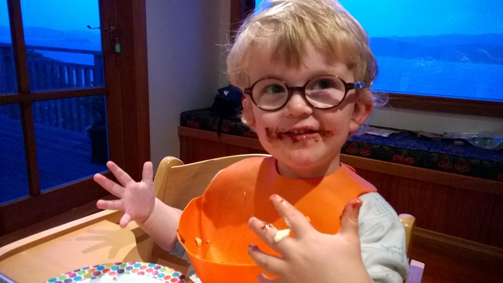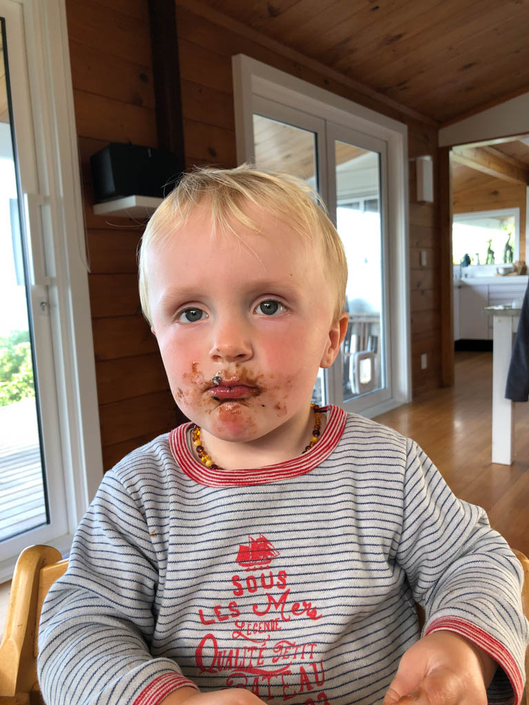 Ce soir, nous avons annonce a Cosmo qu'il ne pourrait pas aller au gala car nous avions prevu, bien avant d'avoir la date, d'aller a d'Urville. Il ne pouvait pas etre plus demoli et agonisait dans ses pleurs. Il etait inconsolable. Mais Hannah a, le lendemain, trouve une idee: il pourrait aller, en avant-premiere, parcourir les lolly-jar et en acheter s'il voulait! C'etait suffisant pour lui regonfler le coeur. Nous avons aussi fait un gateau ensemble (orange chocolat, de Manou) pour contribuer aussi a la fete.