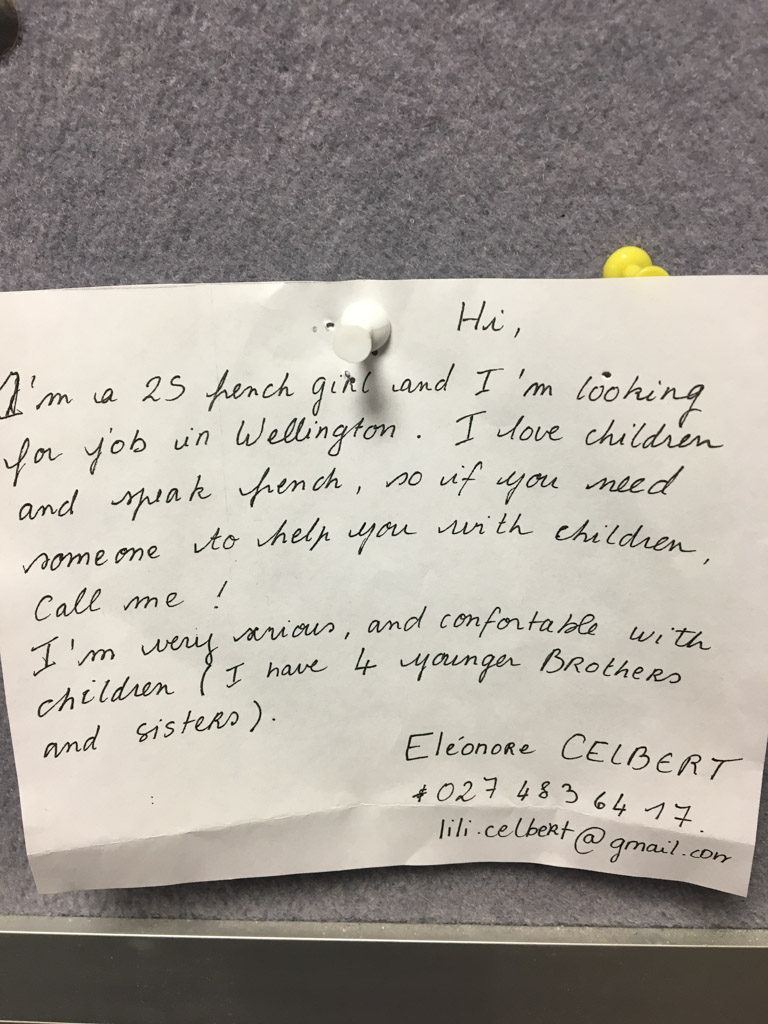J’ai eut mes premiers contacts avec le milieu immobilier de Wellington. Non, il n’y pas grand-chose à louer, oui, il va sûrement falloir acheter. J’ai pu visiter une maison à louer ce matin (la seule que pouvait me proposer l’agence), et bon, c’est pas extraordinaire, et très cher en même temps. Il faut que j’en parle avec Seb et on avisera.