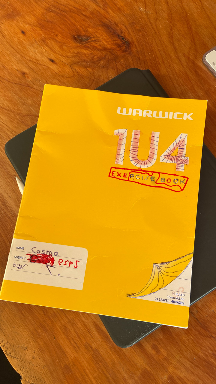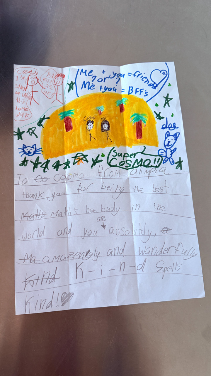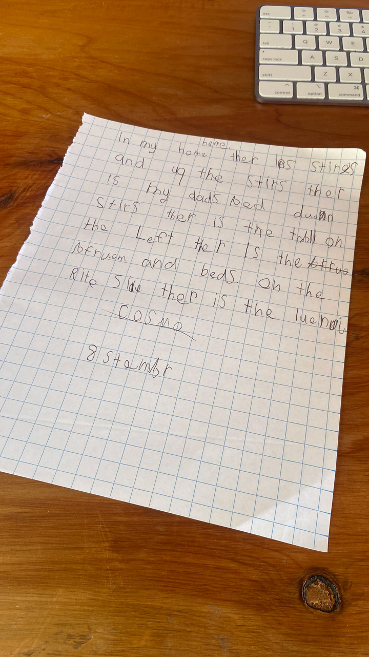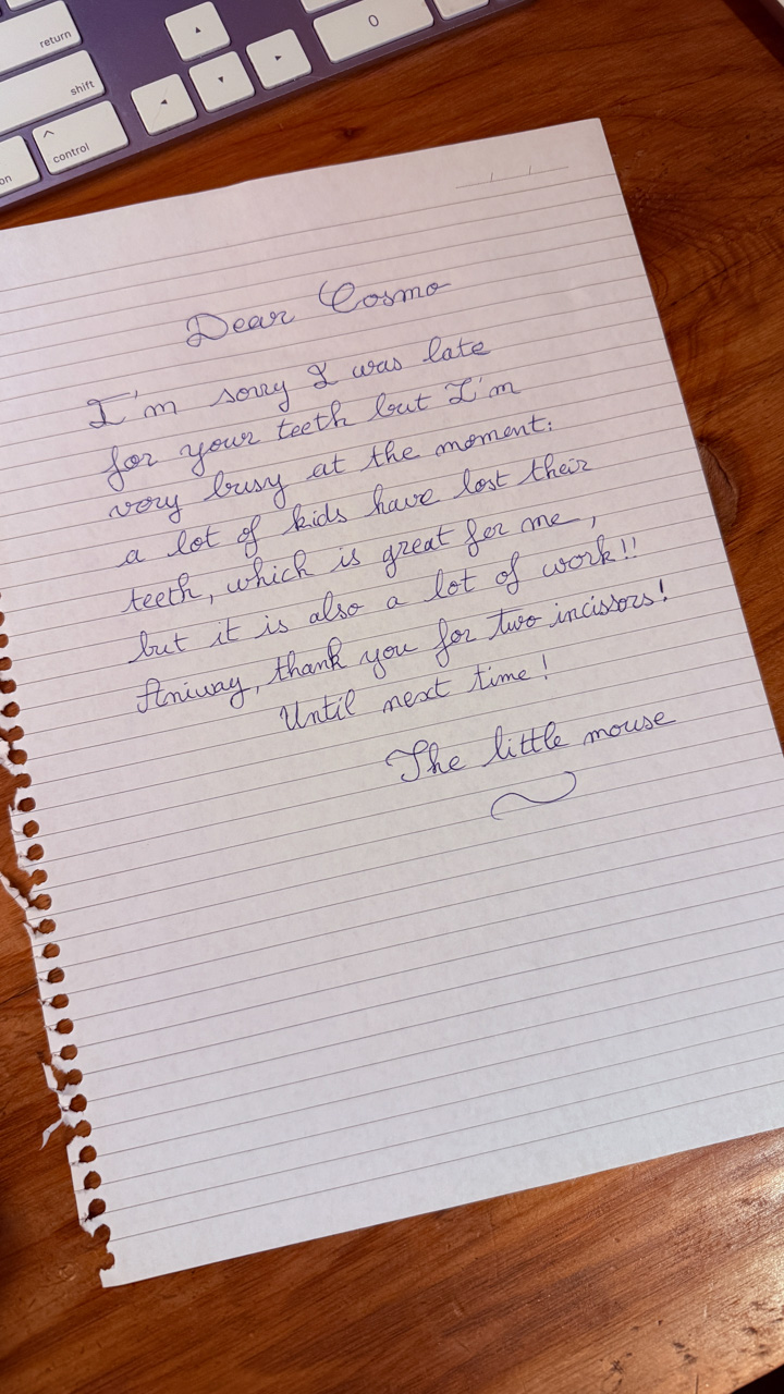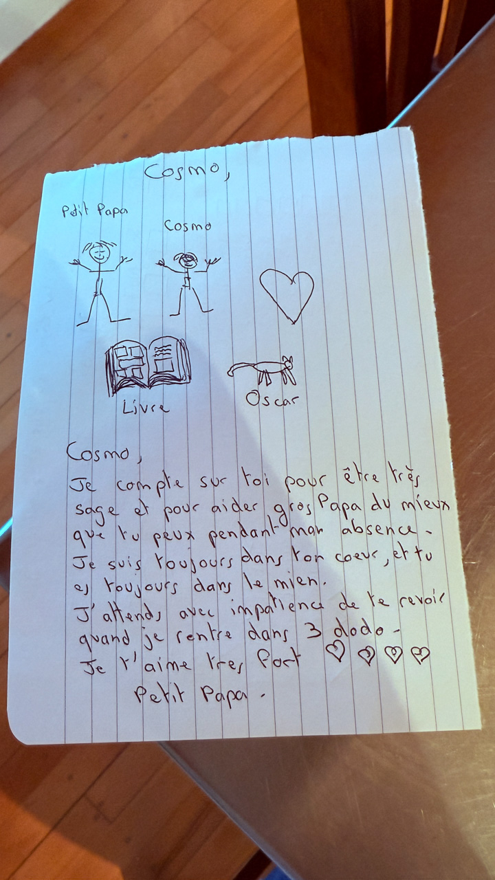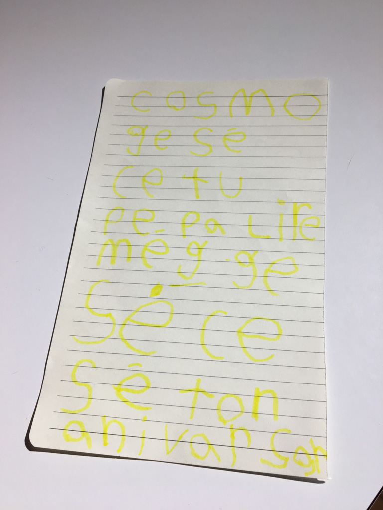 Alors qu'il ecrit les ingredients du gateau que nous avons prepare pour le gala MNS, je constate que l'ecriture de Cosmo est soudainement devenue beaucoup plus appliquee.