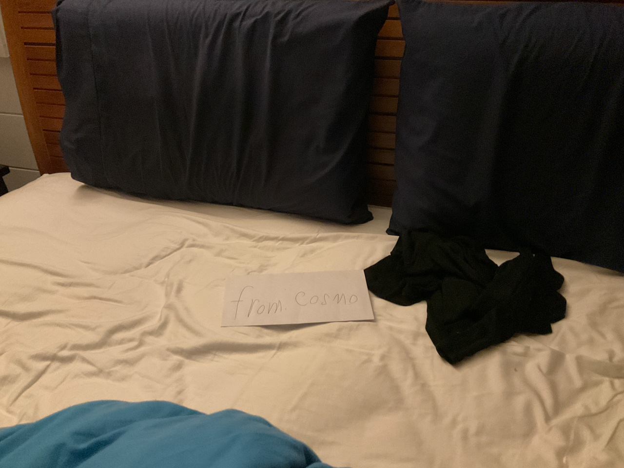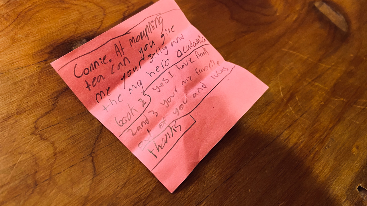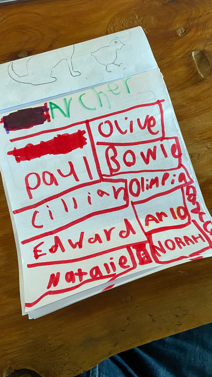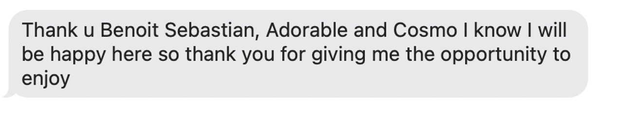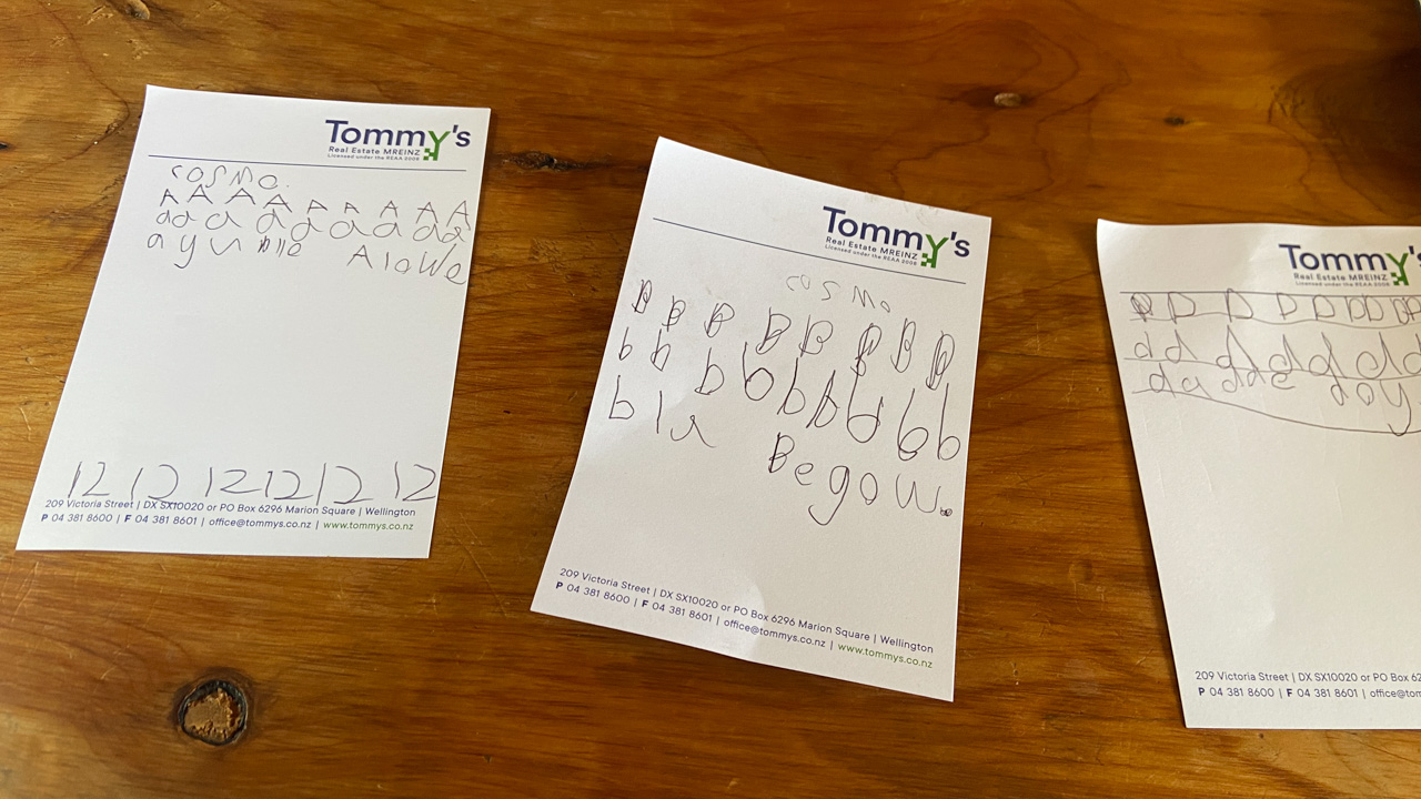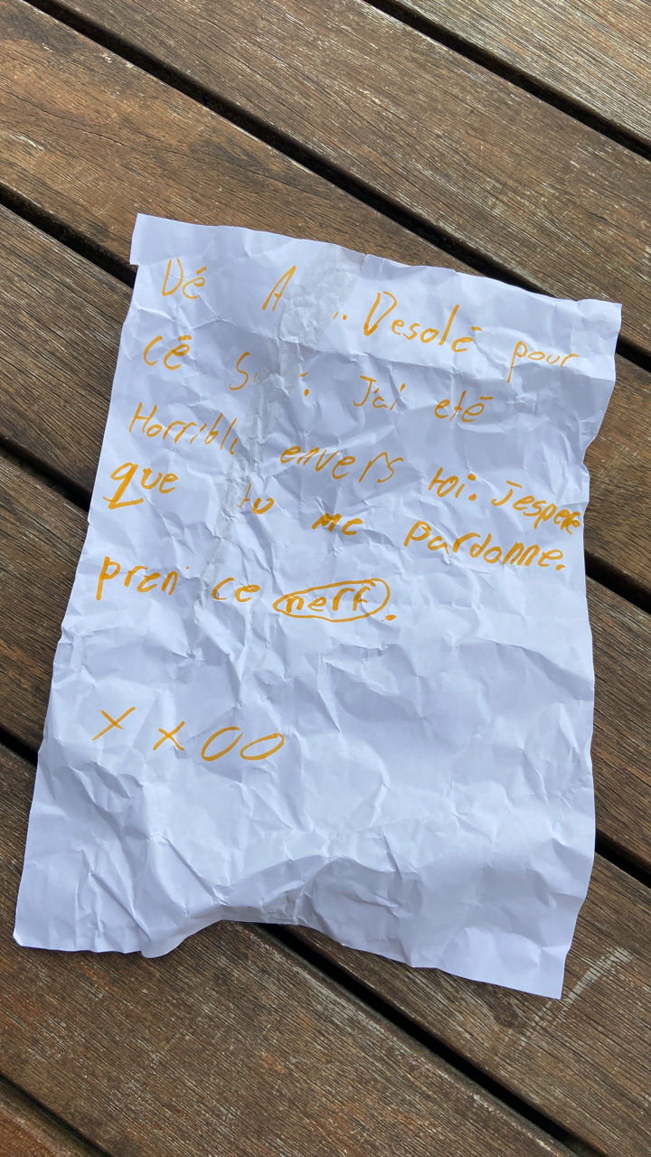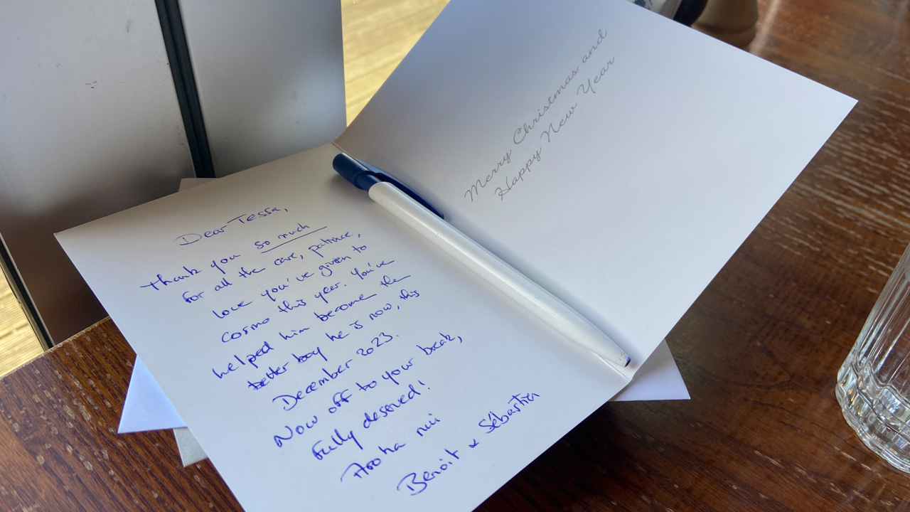 Alors qu'il ecrit les ingredients du gateau que nous avons prepare pour le gala MNS, je constate que l'ecriture de Cosmo est soudainement devenue beaucoup plus appliquee.