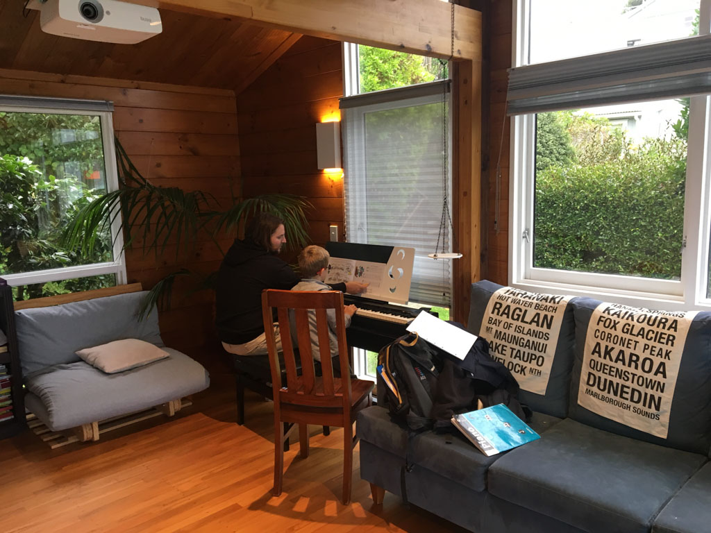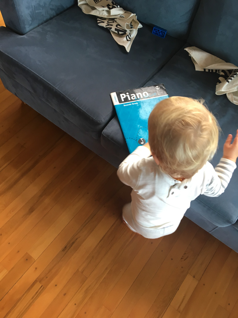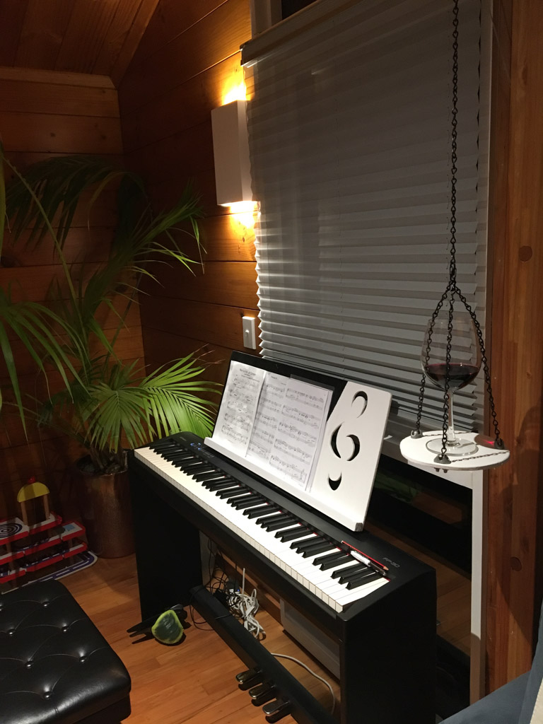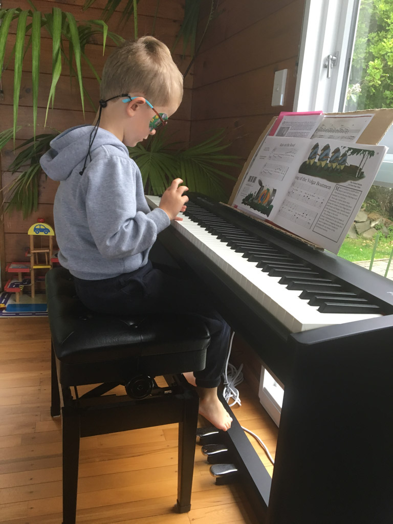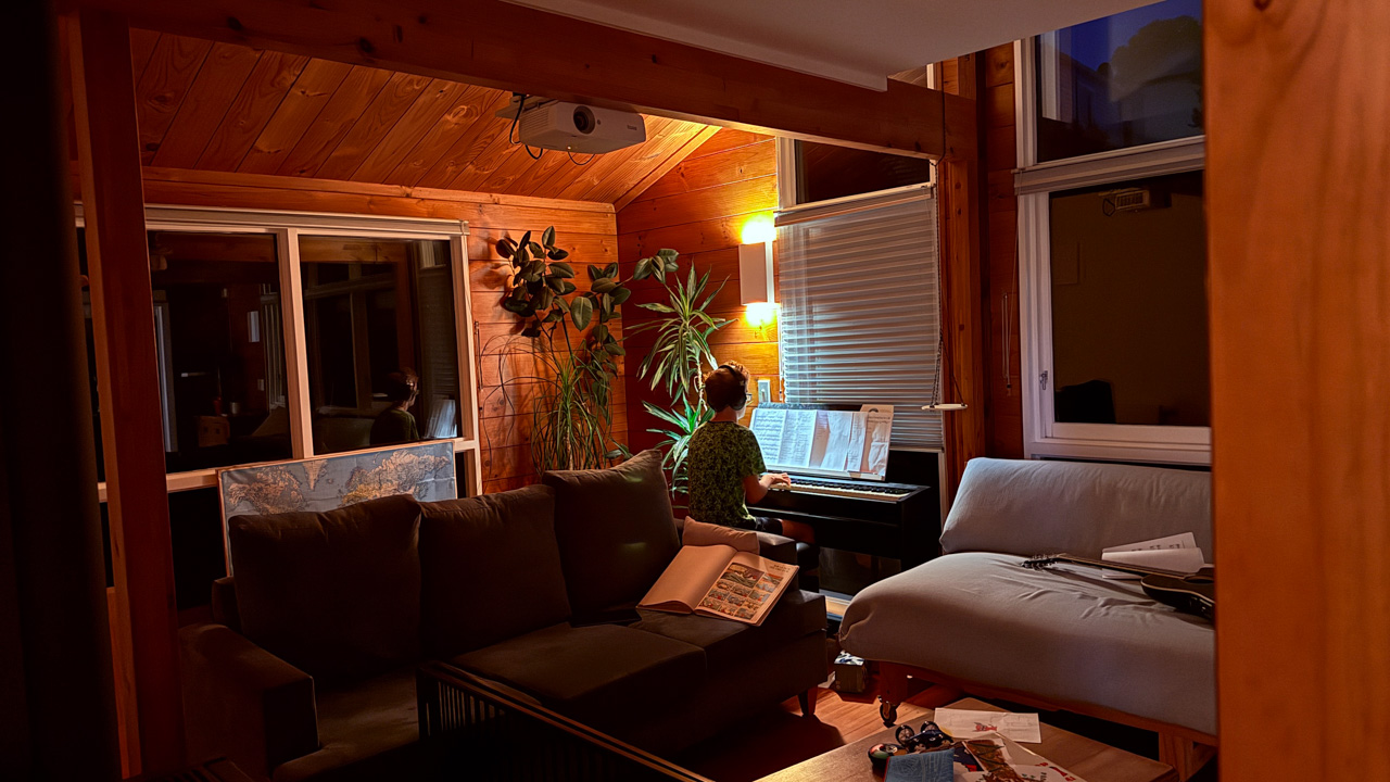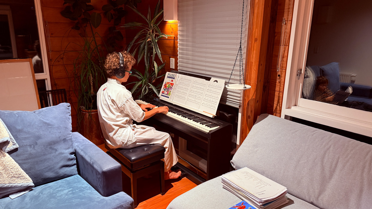Tres souvent, Adan finit de se preparer le matin avant l'heure ou il doit quitter la maison. Il glisse alors vers le piano, enfile le casque et s'entraine (en ce moment, il apprend le theme musical de Tron Legacy). De l'exterieur, aucune note ne nous parvient, mais le bruit des touches qu'il enfonce avec velocite. Les marteaux (numeriques) battent la mesure jusque dans le bureau au dessus du salon!