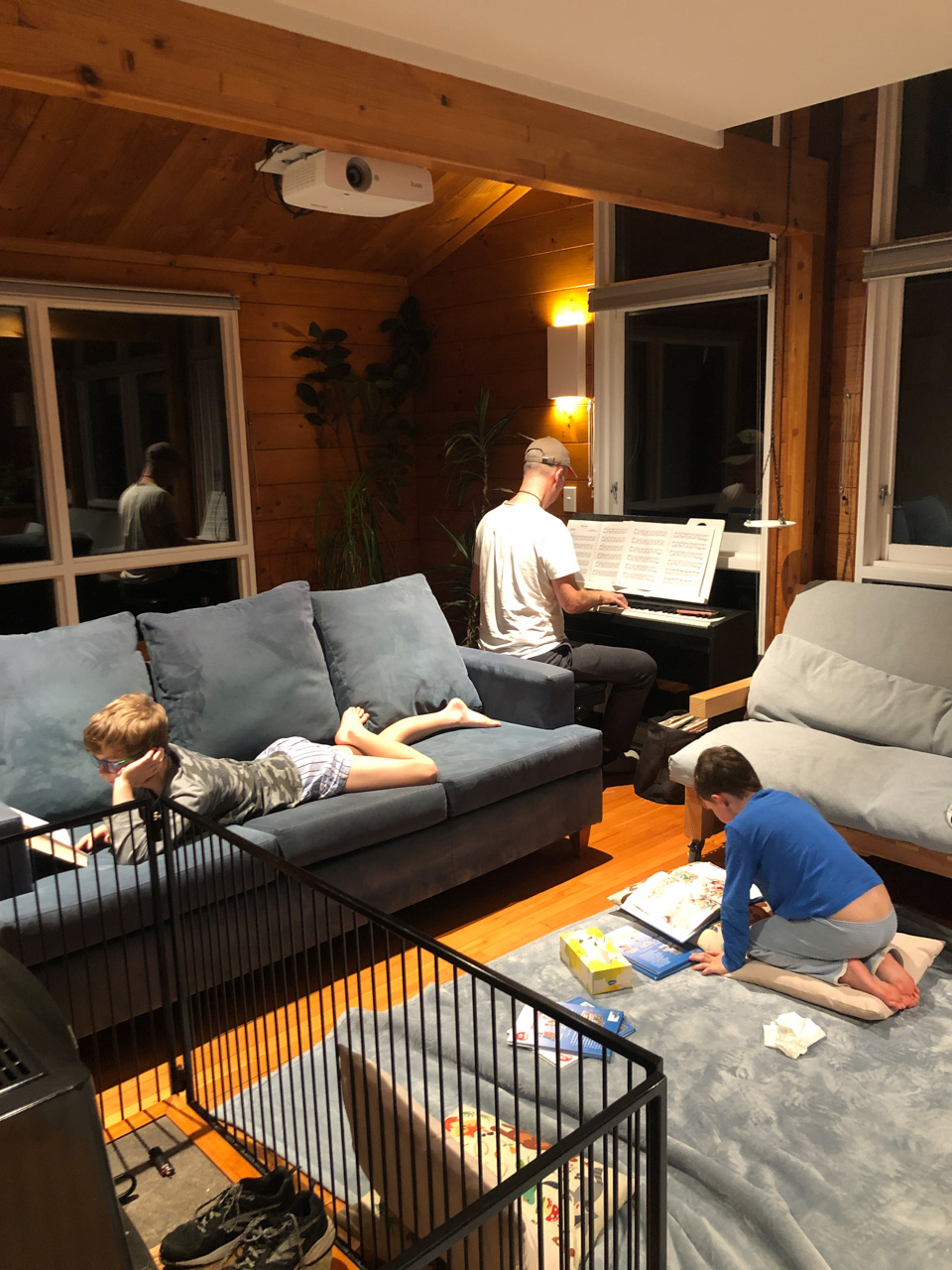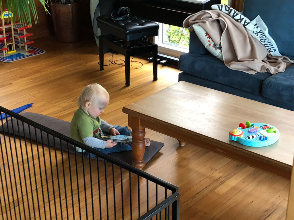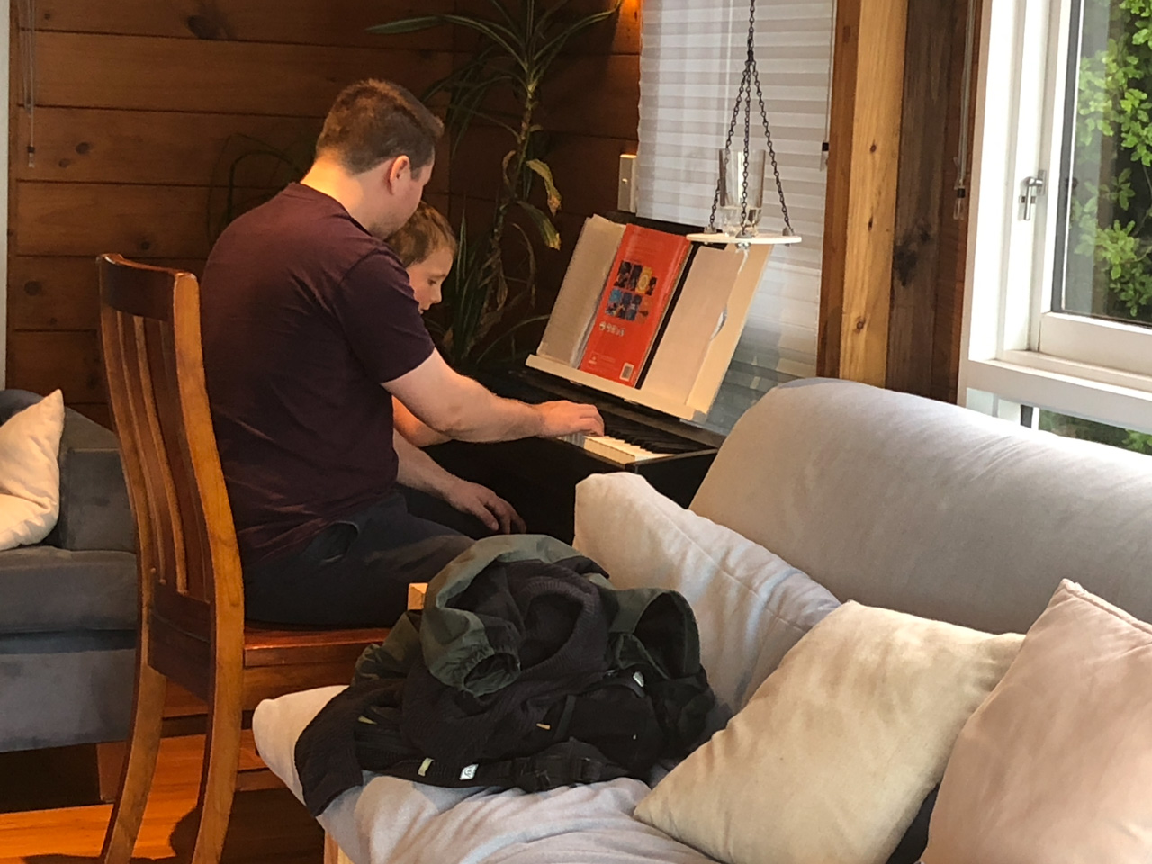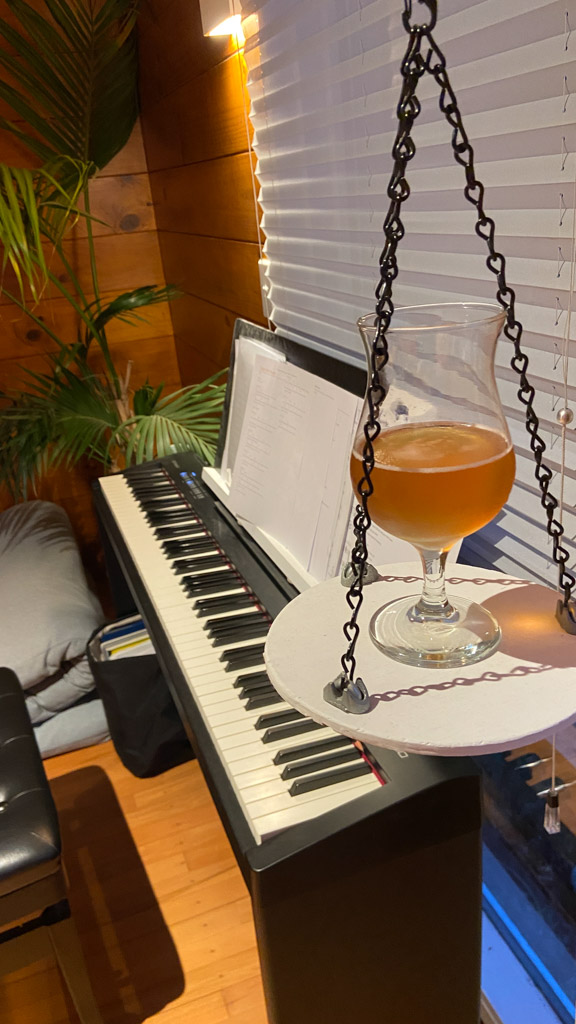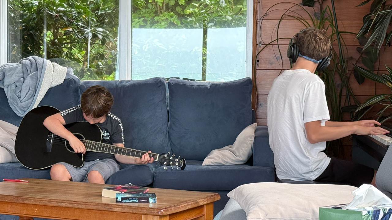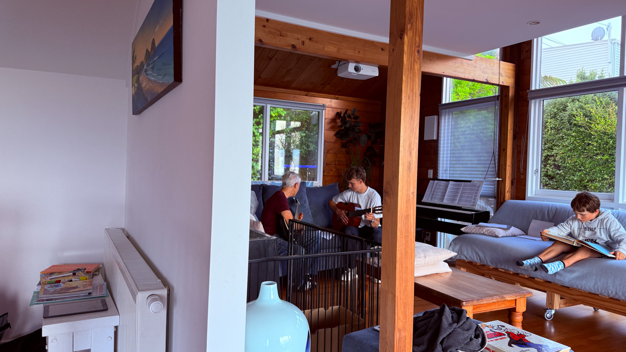 Tres souvent, Adan finit de se preparer le matin avant l'heure ou il doit quitter la maison. Il glisse alors vers le piano, enfile le casque et s'entraine (en ce moment, il apprend le theme musical de Tron Legacy). De l'exterieur, aucune note ne nous parvient, mais le bruit des touches qu'il enfonce avec velocite. Les marteaux (numeriques) battent la mesure jusque dans le bureau au dessus du salon!