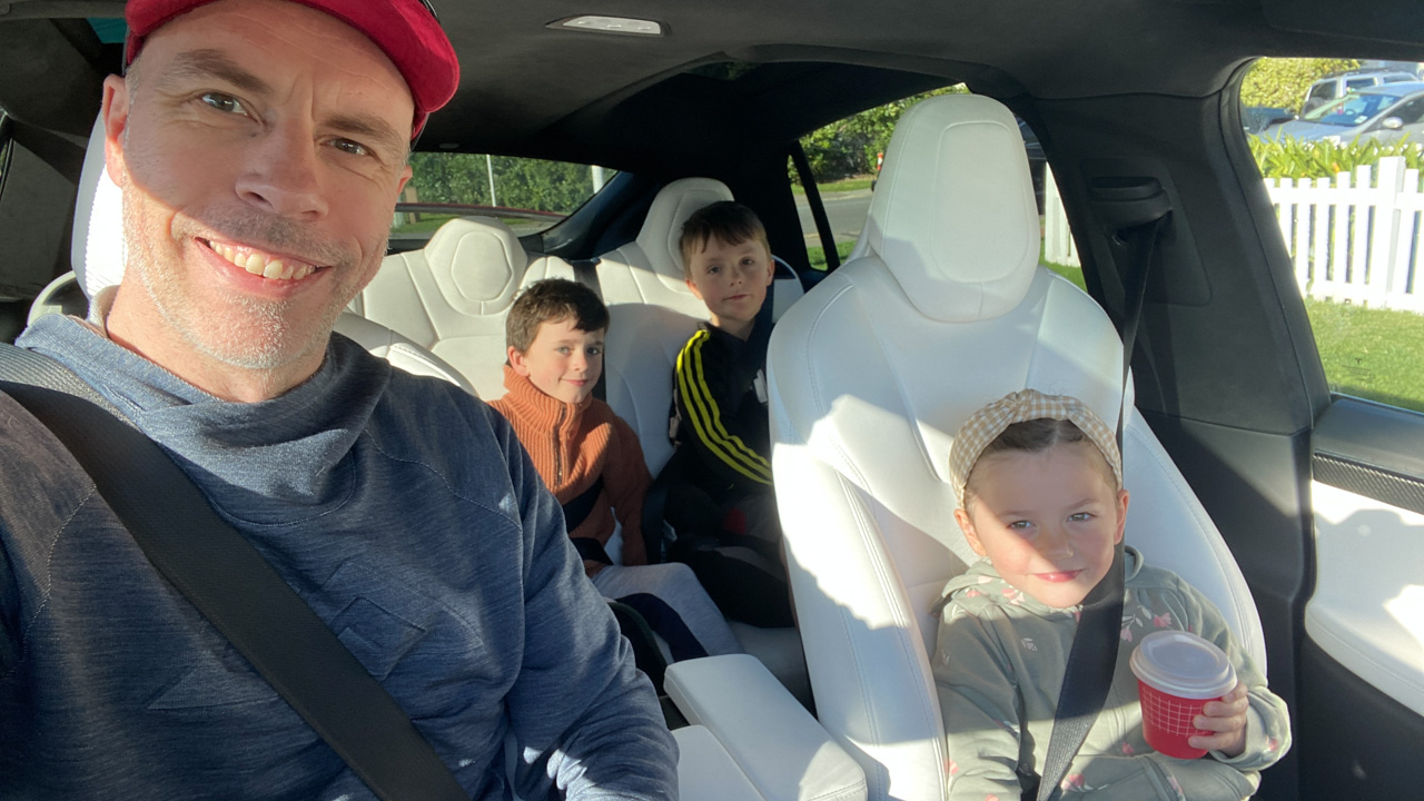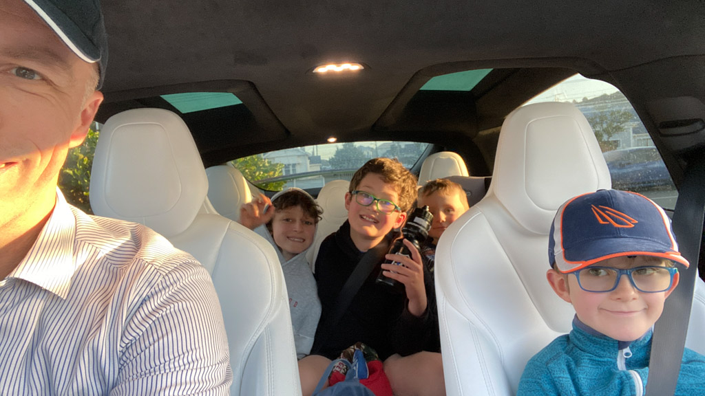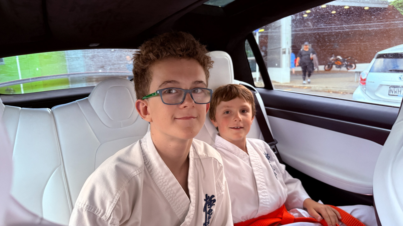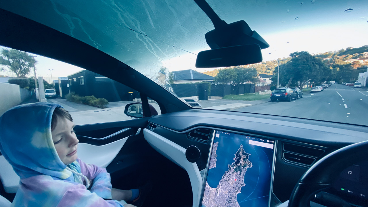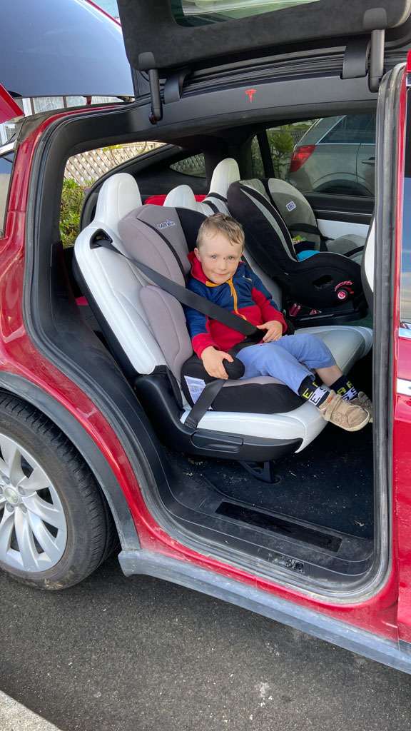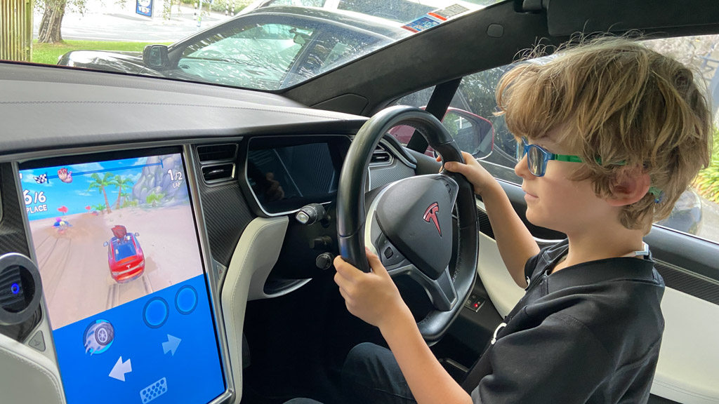 Cosmo a oublie que nous avons une Model Y (version 2026) en pret. L’intérêt numero 1, bien sûr, c’est l’écran a l’arrière.