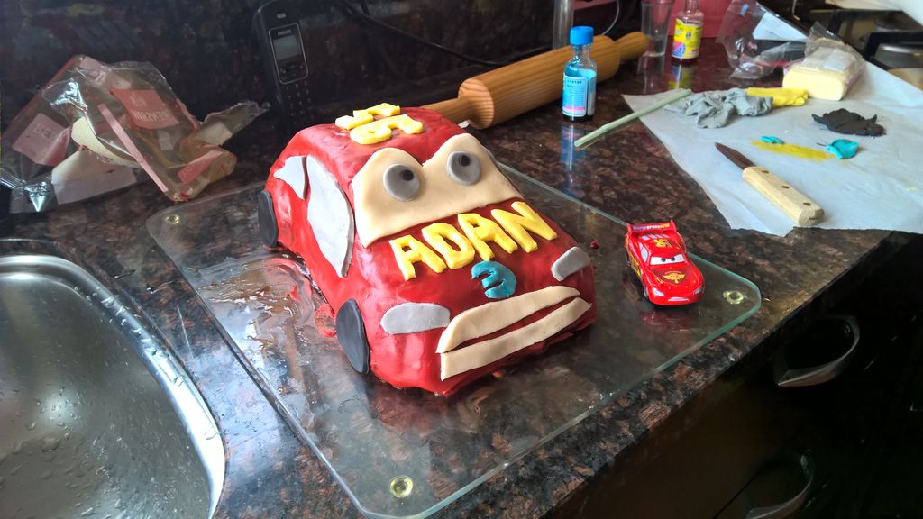 Une realisation de Seb: apres avoir consulte moultes videos sur Youtube, trouve des moules et ingredients adequats, Seb a fabrique ce gateau en forme de Flash McQueen pour la fete d'anniversaire d'Adan!