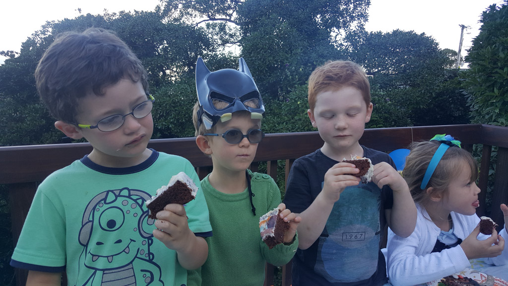 Bien sur, on ne pouvait pas laisser passer l'occasion et nous avons organise une petite fete, exclusivement réservée aux meilleurs amis d'Adan. On y'a donc vu Emily-May, Finn, Harvey, Lucas et Jed. Malgré le froid, les enfants ont passe un bon moment, entre chasse aux trésors dans le jardin et dégommage de Piñata.