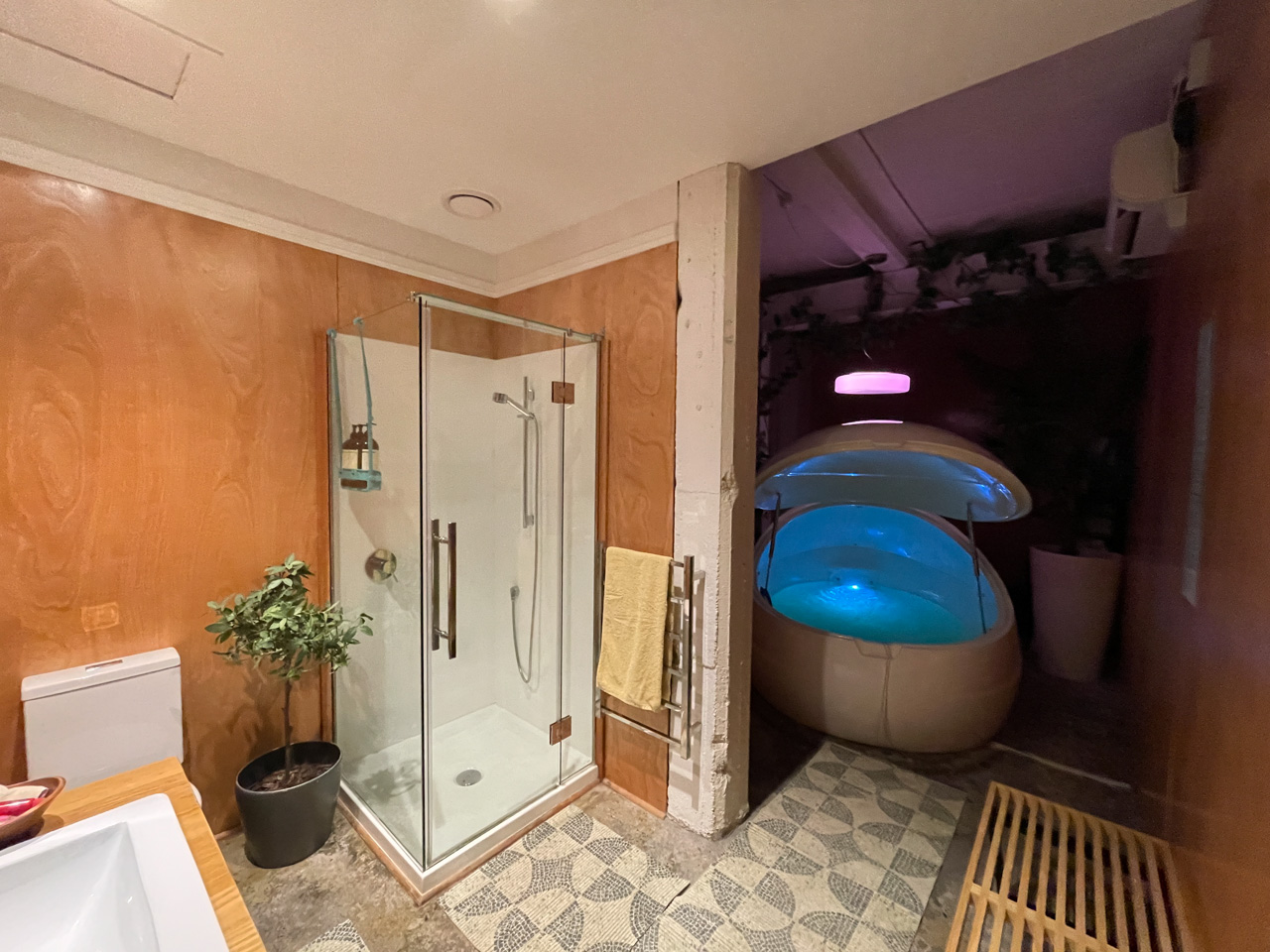 Seb a de la chance: il est le premier dans la famille a essayer les floating pods, ces capsules dans lesquelles se trouve de l'eau tres salee, telement qu'on flotte.
