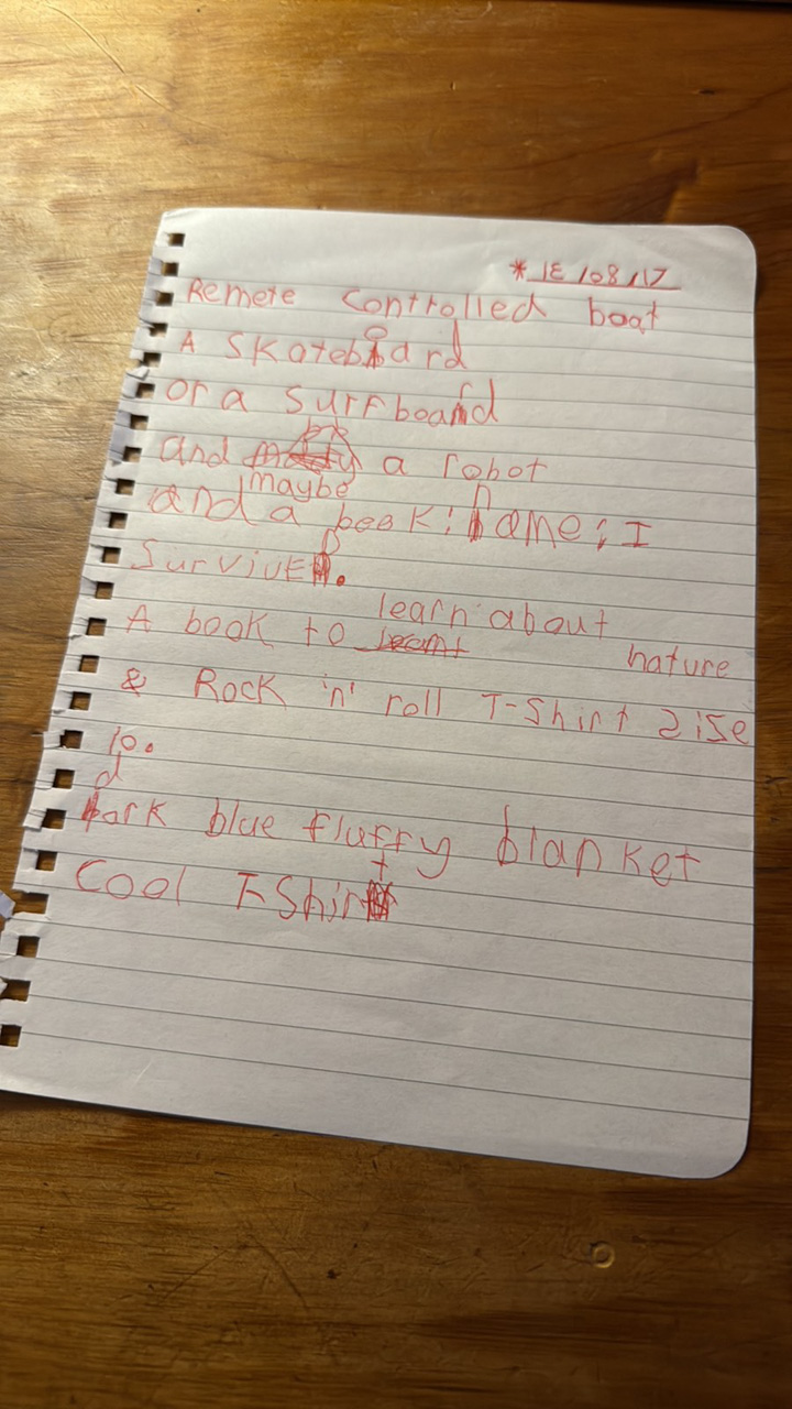 Cosmo a bien reflechi et a ecrit cette liste de cadeaux qui lui feraient plaisir pour son anniveraire.