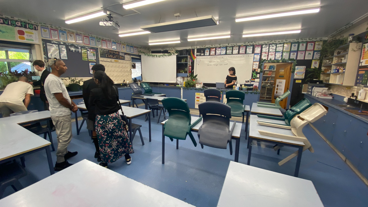 Apres les discours adresses au Year 9 et a leurs parents, nous avons ete dispatches pour rencontrer les profs principaux des enfants. Adan m'a donc emmene a sa classe principale ou nous avons rencontre Amber Bowis. Celle-ci va le suivre, lui et sa classe, pour les 5 prochaines annees.