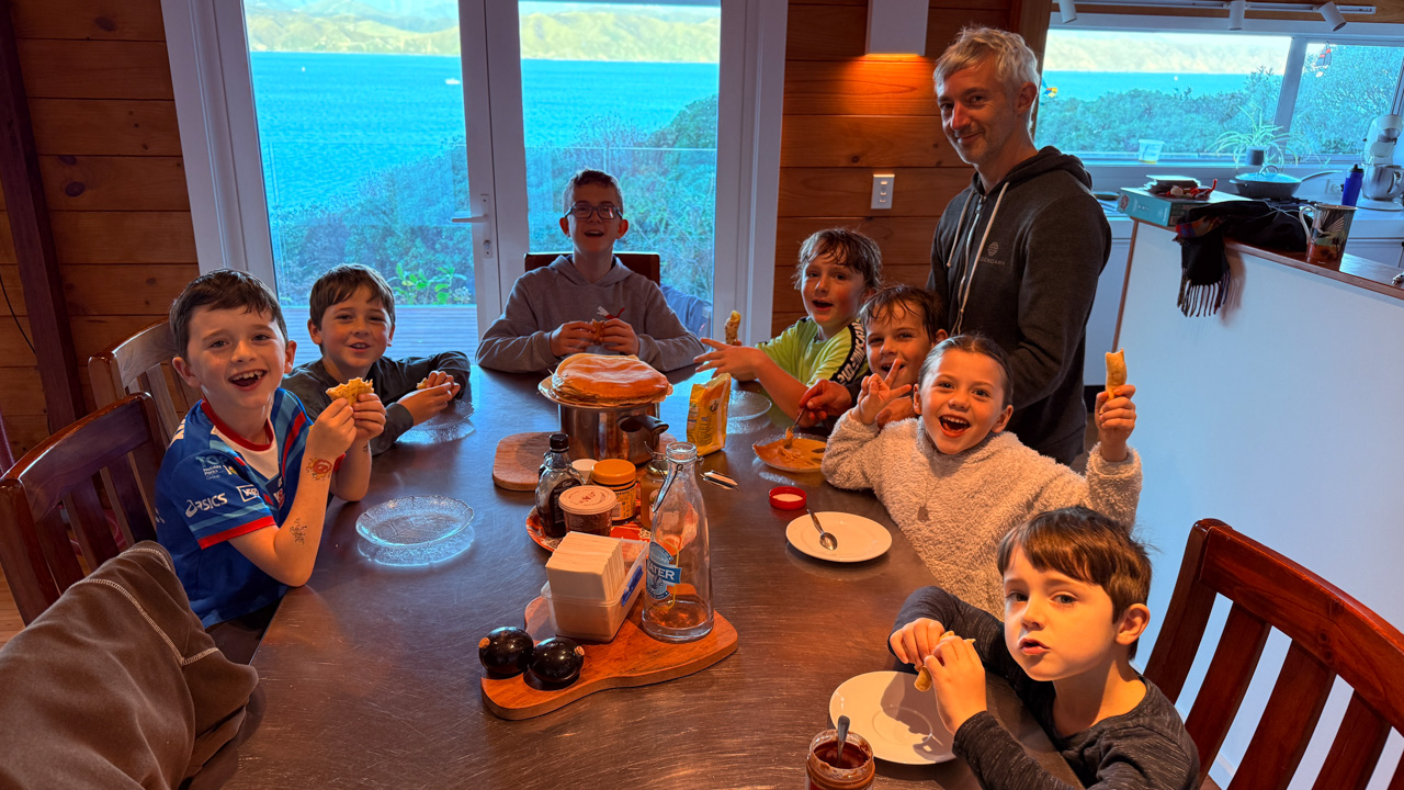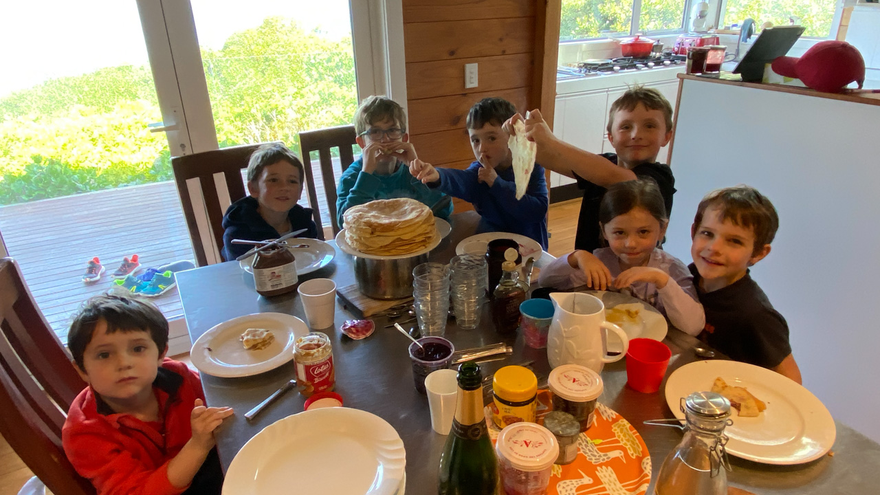 C'est certainement la derniere journee du printemps ou il fait si froid ... alors on fait un cousinade avec une pile de crepes!