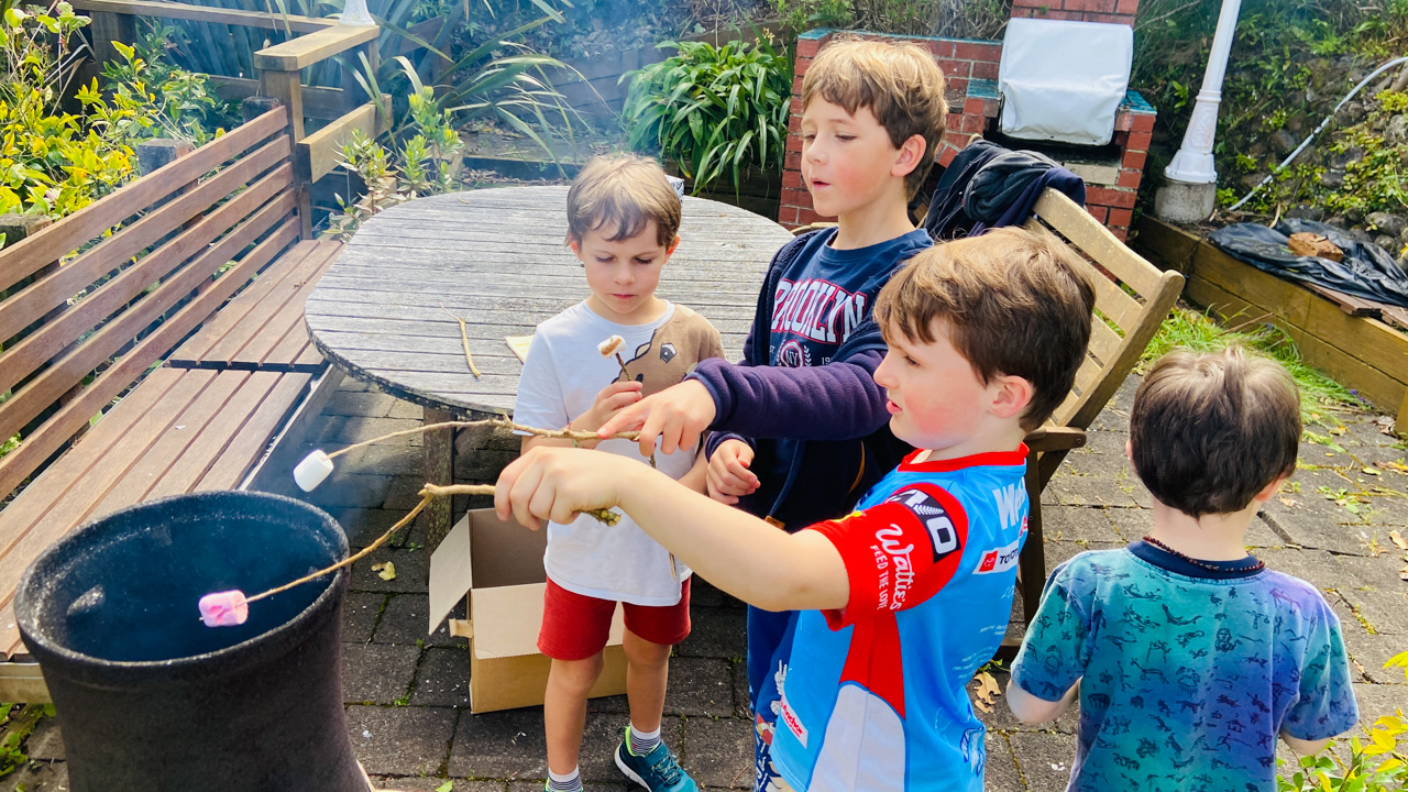 Les cousins sont venus dormir a la maison. Comme la meteo s'y pretait, on a fait un feu dehors ... et sorti les chamallows.