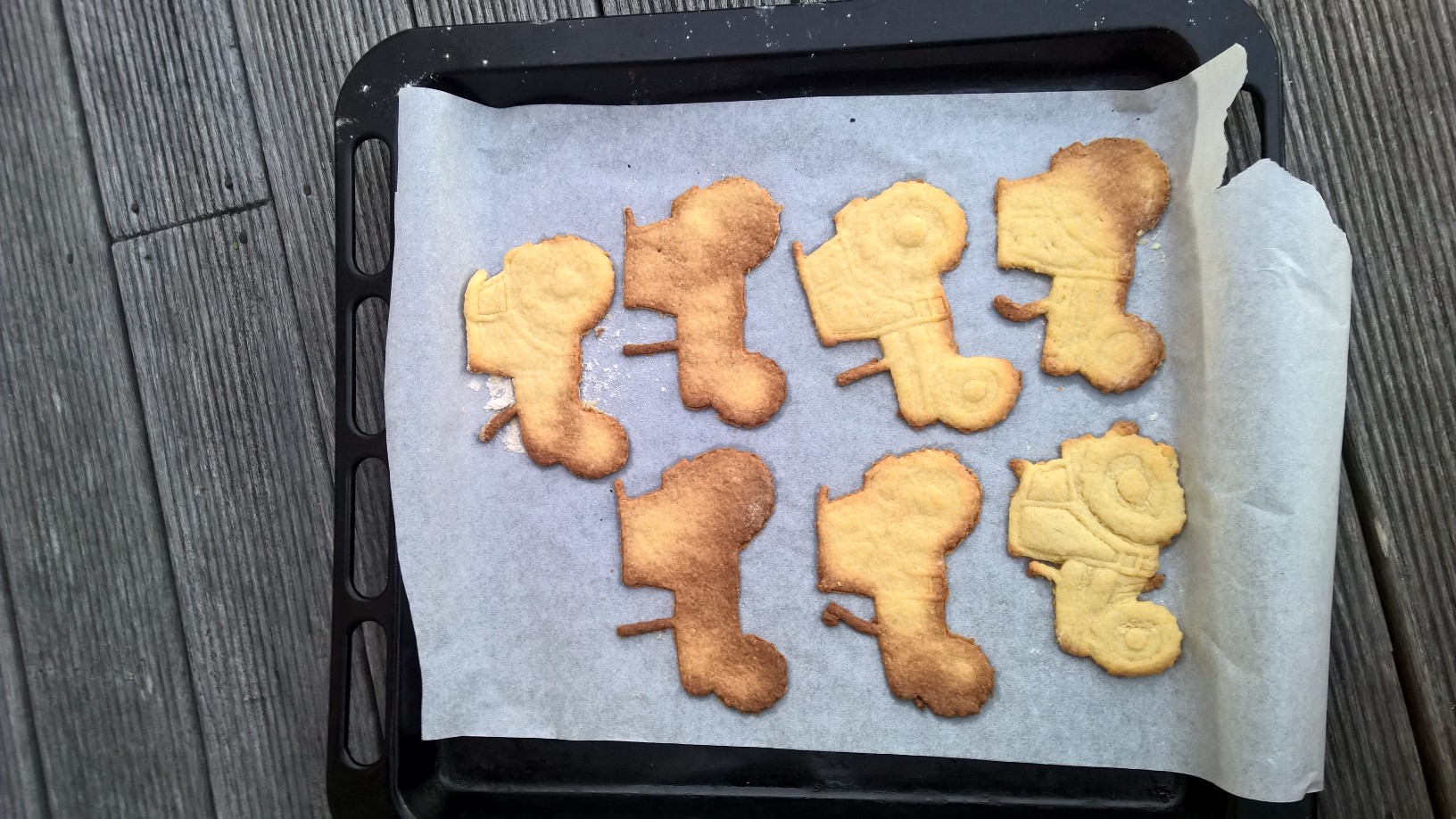 L'ami Oliver nous a imprime, en 3D, un decoupe-biscuit, en forme de tracteur! L'activite de la soiree a donc ete de les fabriquer, ce qu'Adan a adore. Voici le resultat!