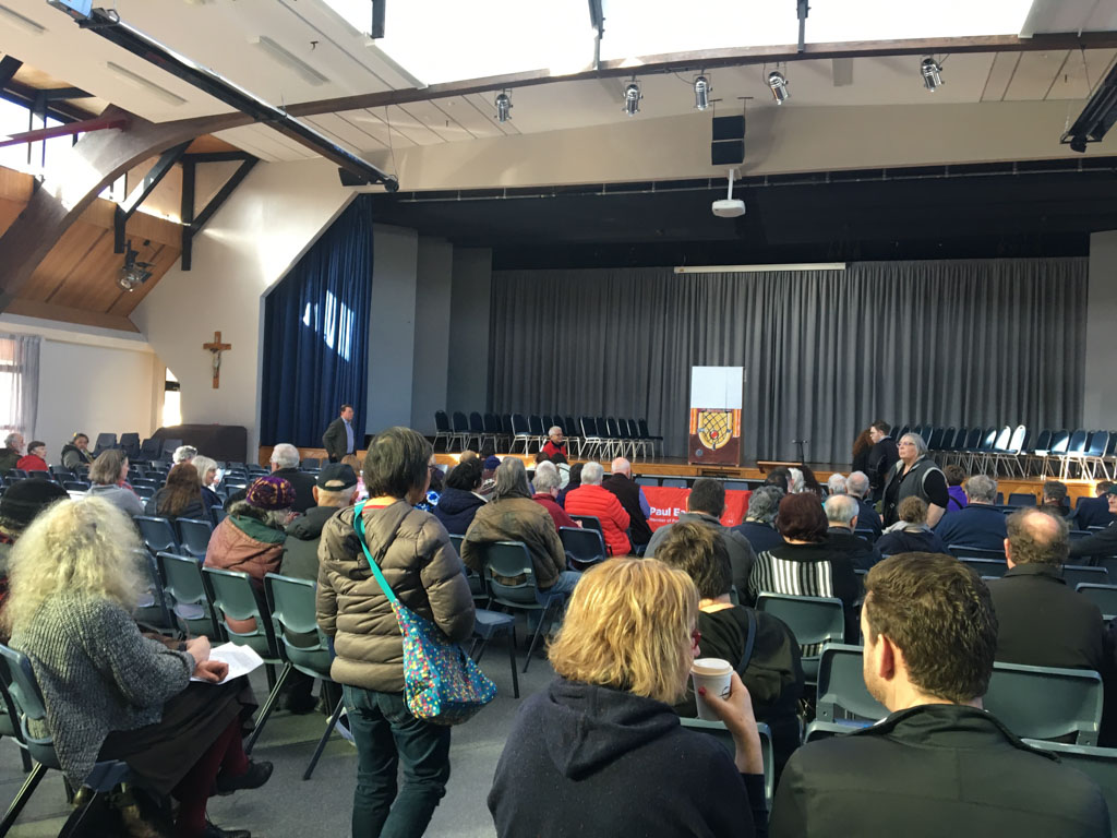 Au moment de quitter l'estrade, le député présent a demandé: "qui dans l'assemblée est favorable à des bus électriques", et ce sont trois quarts des mains qui se sont levées (mais moins qu'une semaine avant où 300 personnes sur 301 avaient soutenu la proposition)! Une journaliste de Radio New Zealand est ensuite venue nous interroger et nous prendre en photo, et j'ai aussi pu parler de notre pétition, qui a rassemblé, pour le moment, à peu près 500 signatures.