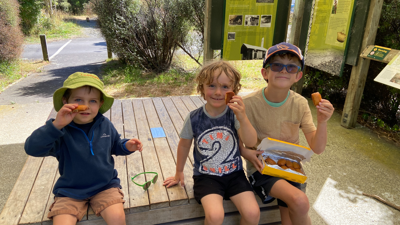 Quand j'etais petit, les parents cachaient une boite de Chamonix quand nous partions en promenade et pretendaient que l'ours les avait laisse dans la montagne. J'etais donc ravi de mettre a profit la boite que nous avons recu par la poste afin d'encourager les garcons a prendre part a la promenade dans le Rimutaka.